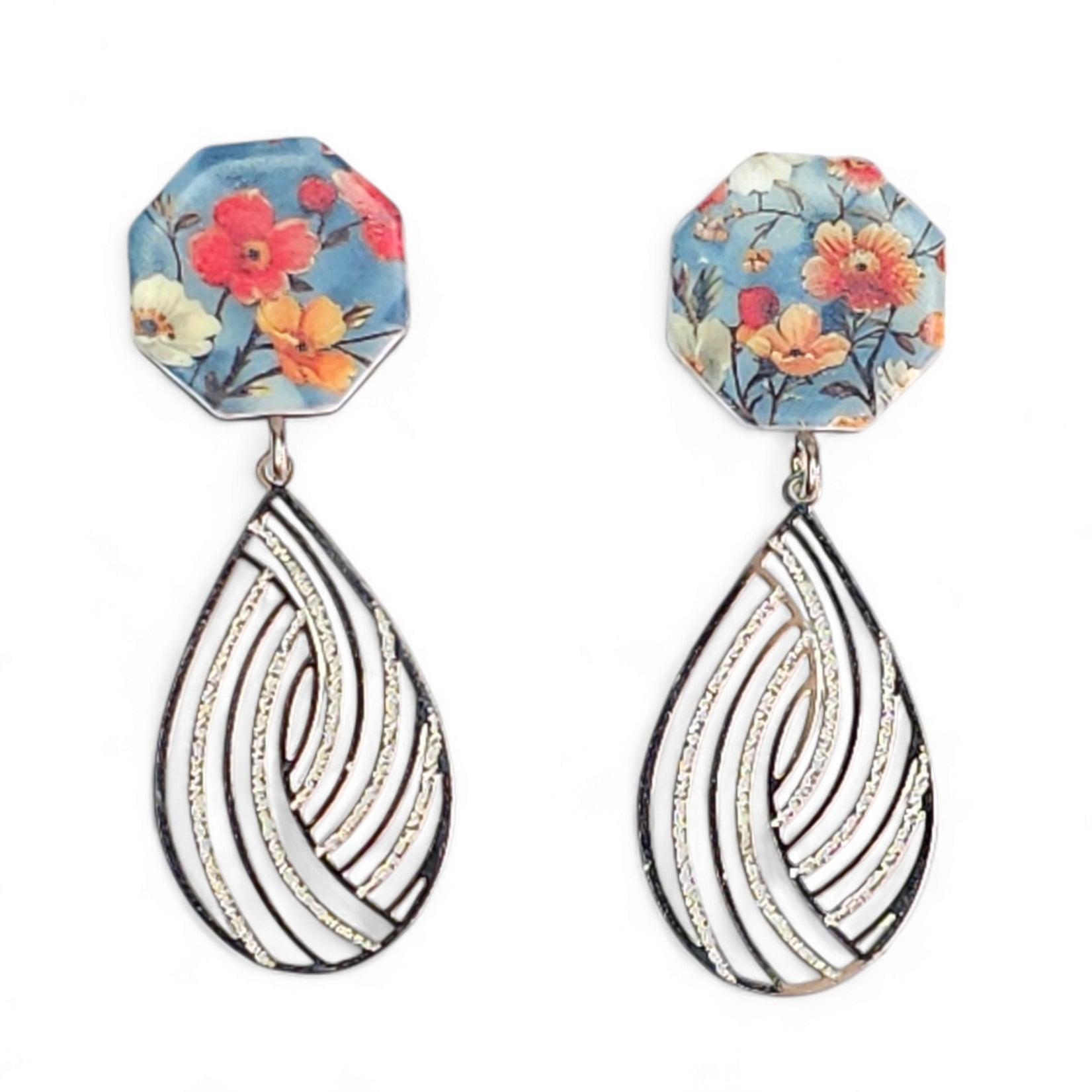 Κρεμαστά πολύγωνα σκουλαρίκια με τεχνική μεταφοράς εικόνας σε πολυμερικό πηλό και ατσάλινα δαντελένια φιλιγκράν σε σχήμα δάκρυ.