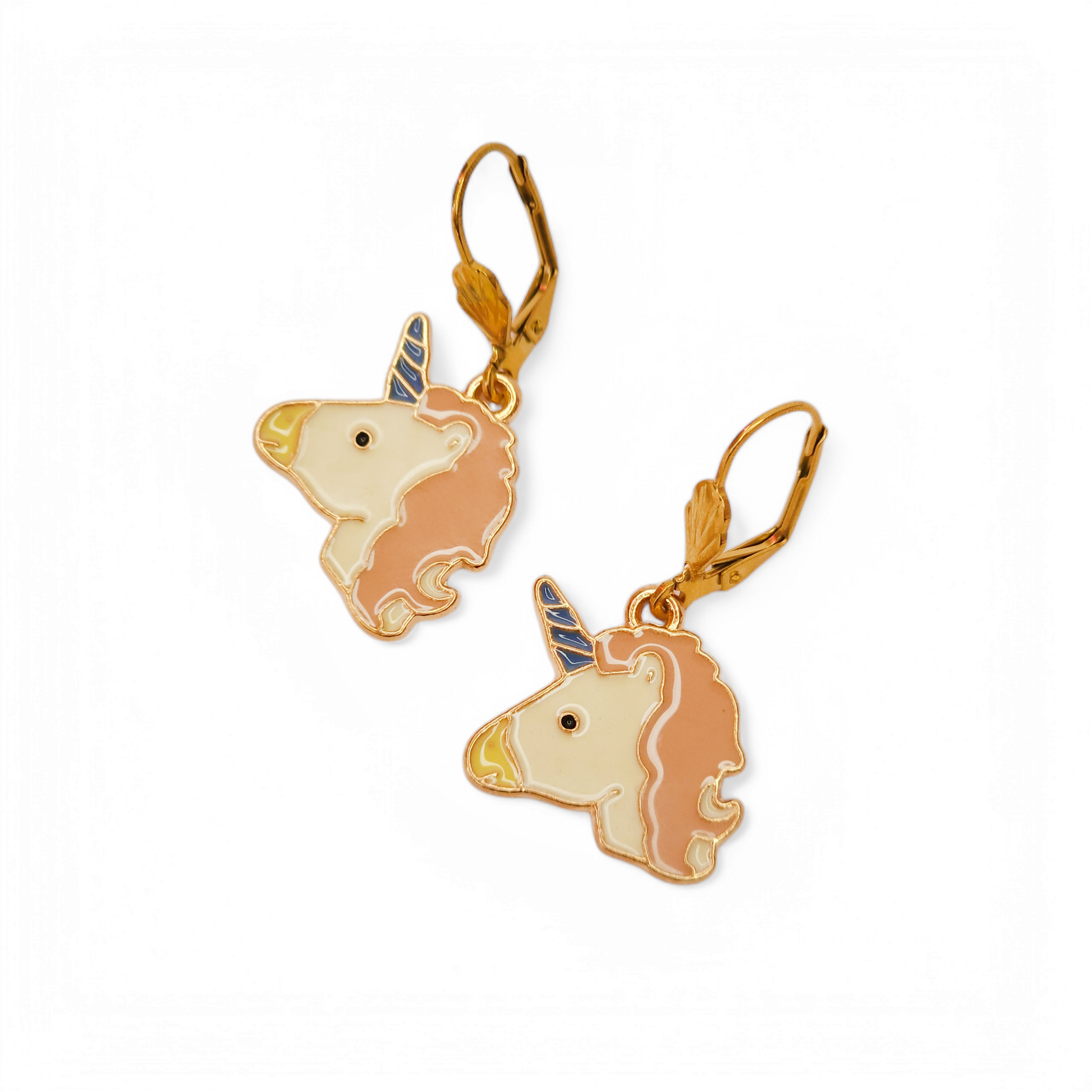 Κρεμαστά σκουλαρίκια μονόκεροι σε απαλό ροζ μέταλλο με σμάλτο.