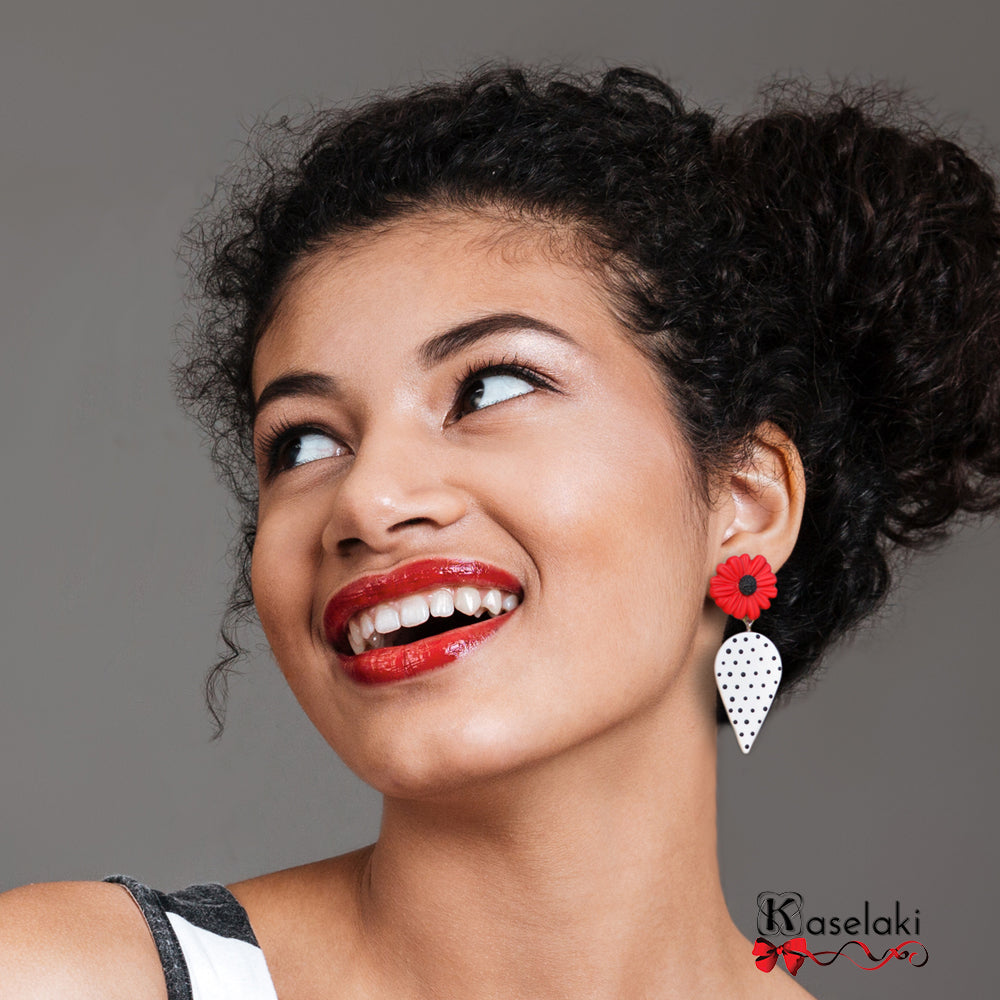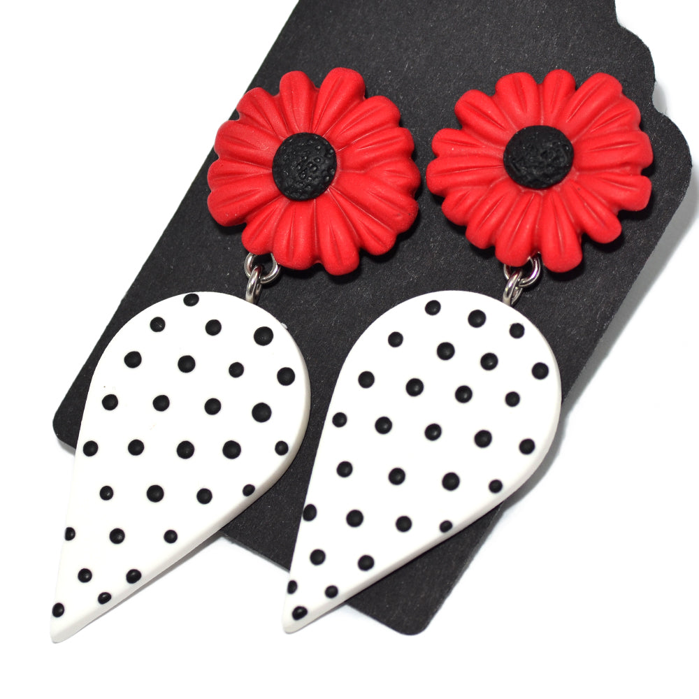 Κρεμαστά σκουλαρίκια με ένα κρεμαστό στοιχείο δάκρυ λευκό με μαύρο πουά κι ένα σταθερό στοιχείο κόκκινη μαργαρίτα από πολυμερικό πηλό.