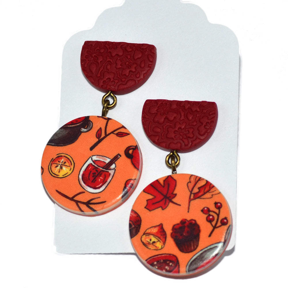 Χειροποίητα κρεμαστά σκουλαρίκια με ένα σταθερό μπορντό ανάγλυφο ημικύκλιο στοιχείο κι ένα κρεμαστό στρογγυλό με θέμα Thanksgiving σε φθινοπωρινές αποχρώσεις.