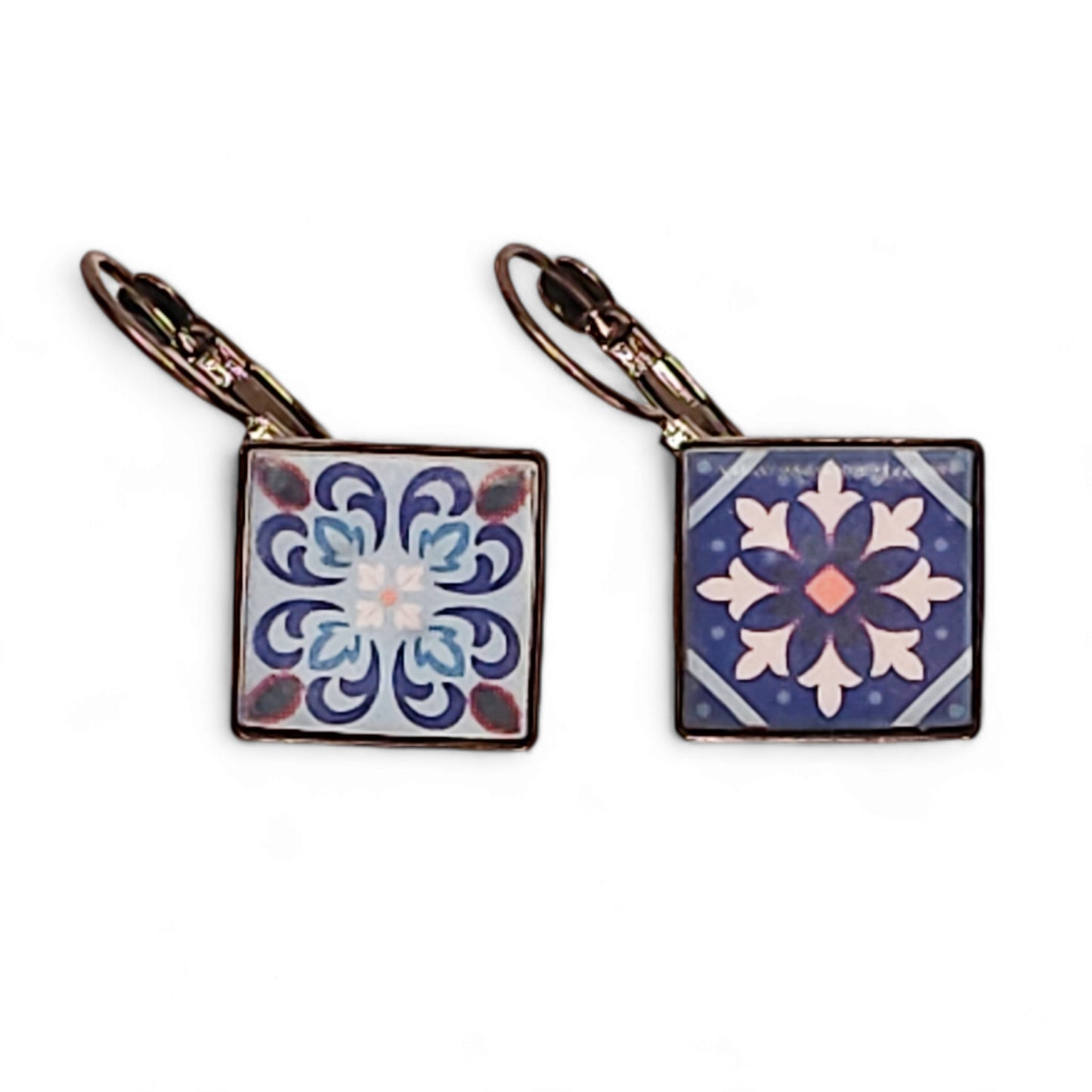 Λίγο κρεμαστά ανόμοια σκουλαρίκια τετράγωνα πλακάκια μπλε σε ατσάλινες βάσεις