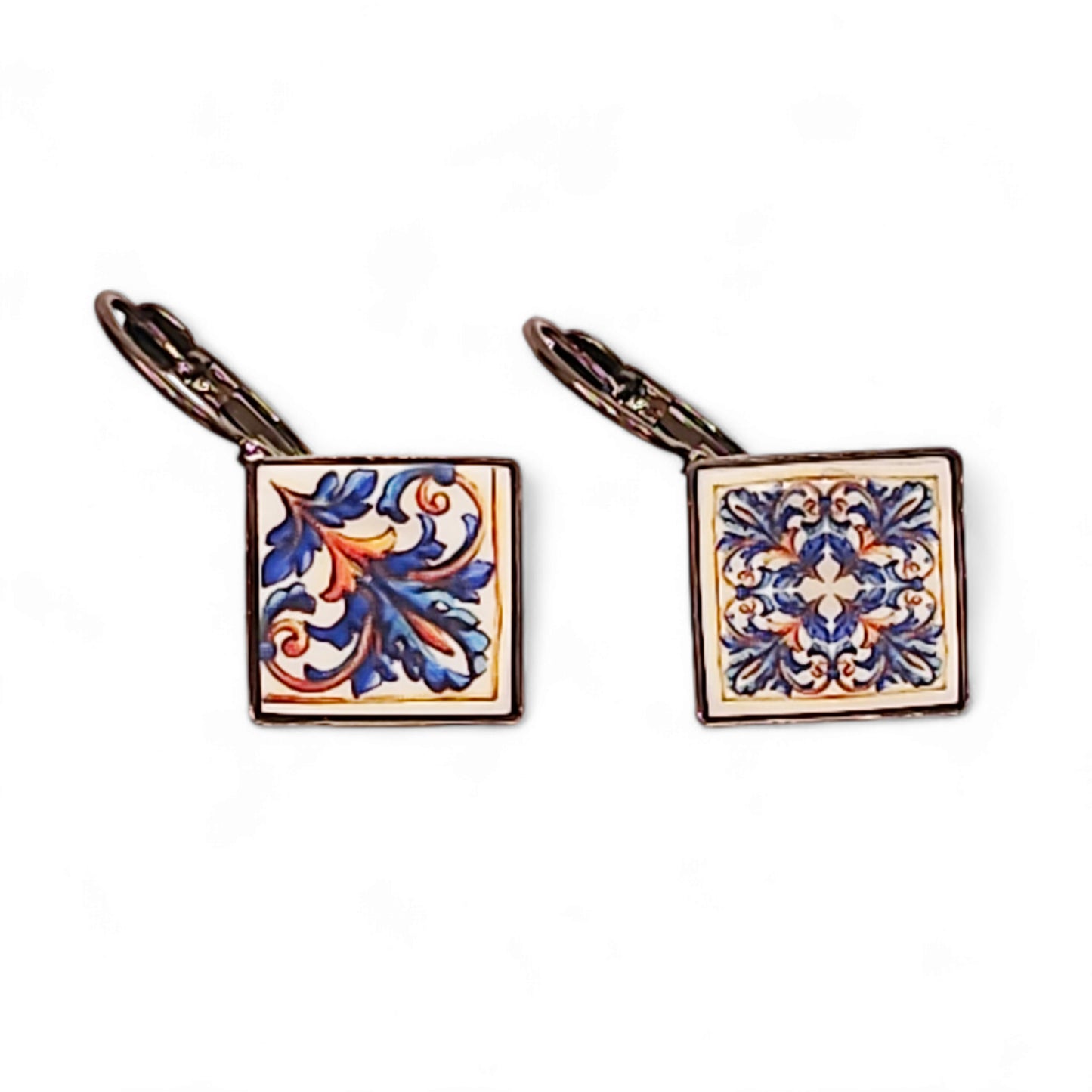 Λίγο κρεμαστά ανόμοια σκουλαρίκια τετράγωνα πλακάκια μπλε σε ατσάλινες βάσεις