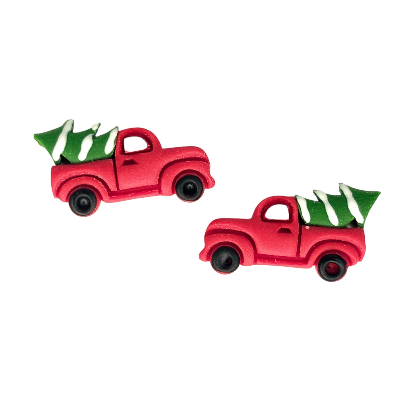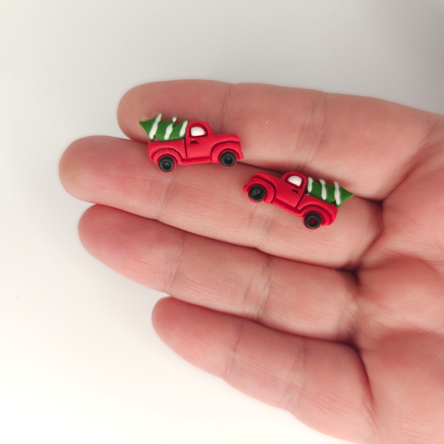 Λιλιπούτεια κόκκινα αυτοκινητάκια που κουβαλάνε από ένα χριστουγεννιάτικο δεντράκι. Καρφωτά σκουλαρίκια γλυπτέ στο χέρι με πολυμερικό πηλό.