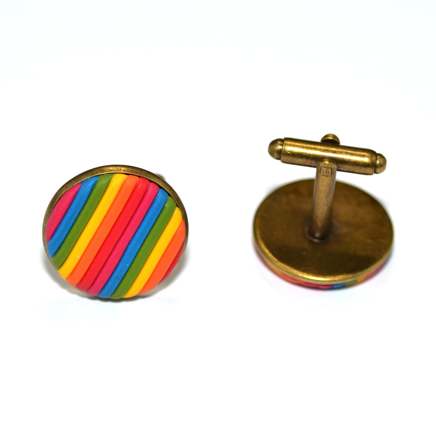 Μανικετόκουμπα σε στρογγυλές μπρονζέ βάσεις με χειροποίητα καμποσόν από πολυμερικό πηλό με ρίγες στα χρώματα του ουράνιου τόξου.