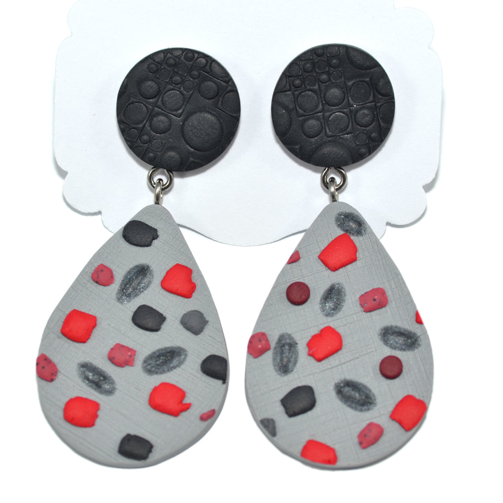 Μεγάλα κρεμαστά γκρι σκουλαρίκια δάκρυα με πιτσιλωτό μοτίβο