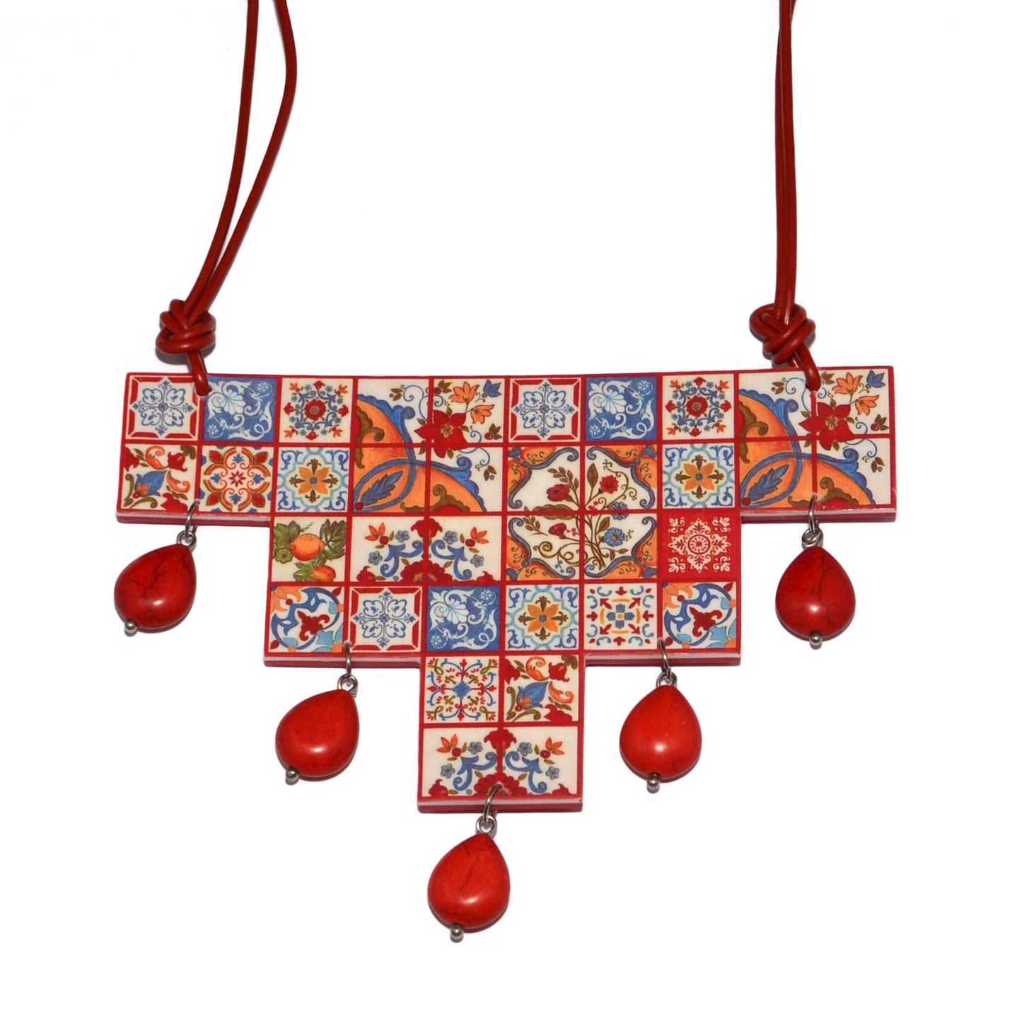 Μεγάλο εντυπωσιακό κολιέ με πλακάκια λαϊκής τέχνης σε κόκκινες αποχρώσεις με πέτρες χαολίτη