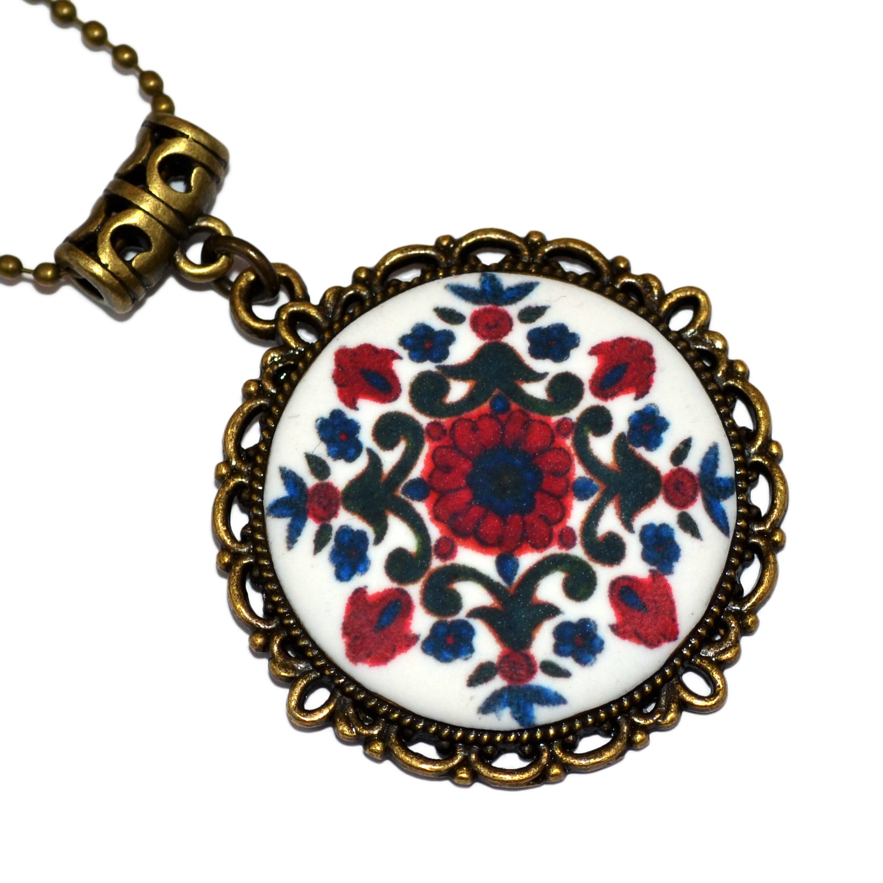 Μενταγιόν σε βίνταζ μπρονζέ στρογγυλή βάση, με χειροποίητο καμποσόν από πολυμερικό με την τεχνική μεταφοράς εικόνας με folk art κόκκινο μοτίβο σε λευκό φόντο.