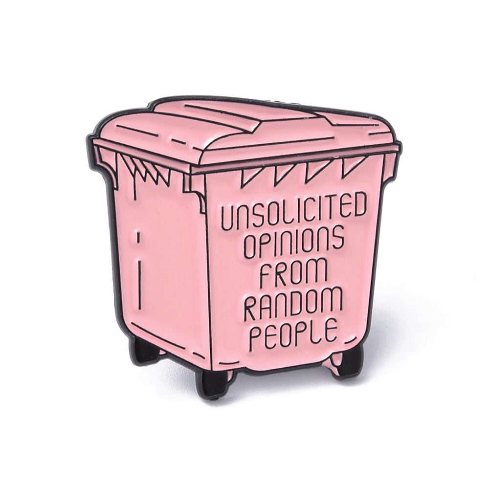 Μεταλλική καρφίτσα με σαρκαστική διάθεση ροζ σκουπιδοτενεκές "UNSOLICITED OPINIONS FROM RANDOM PEOPLE"