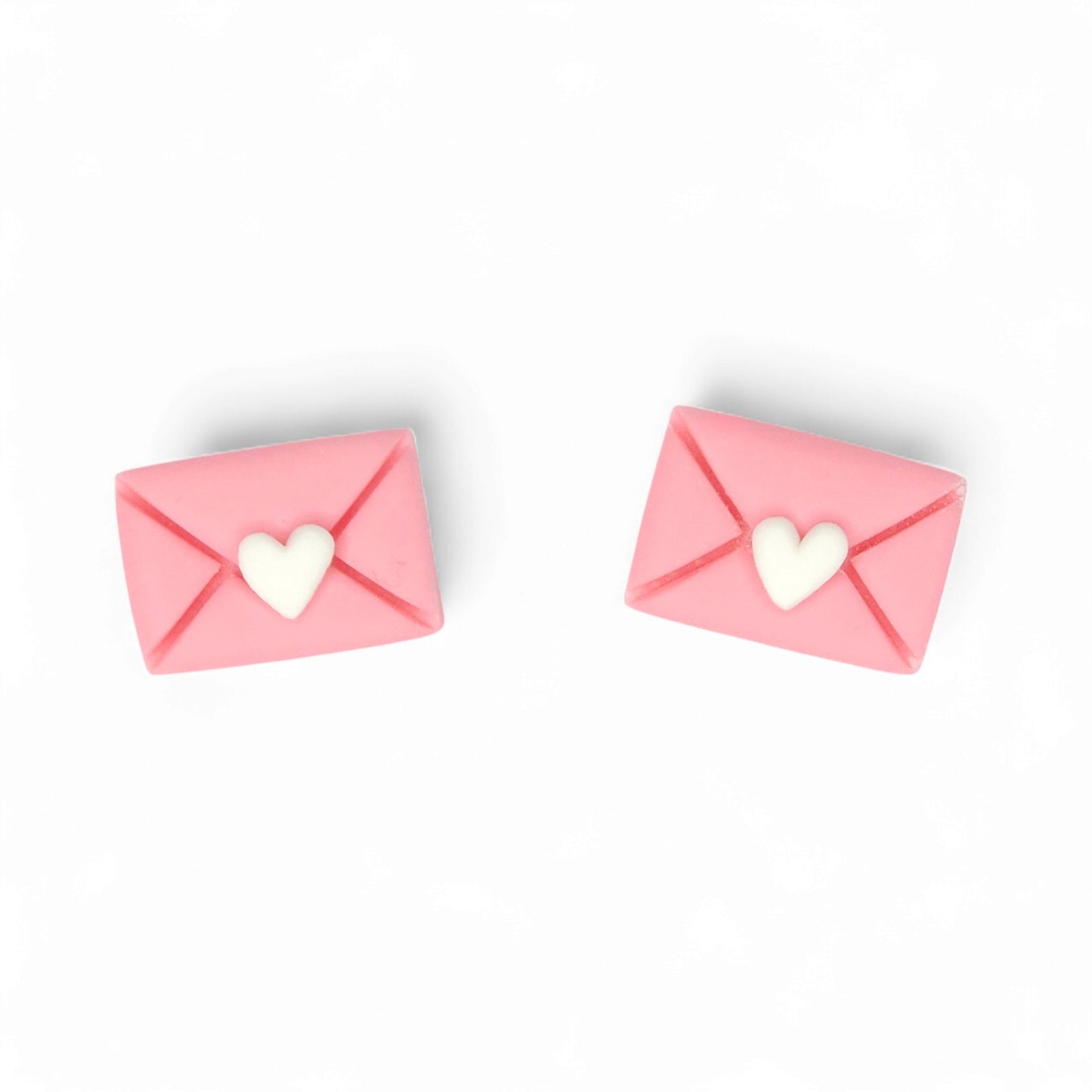 Μικρά καρφωτά σκουλαρίκια ροζ γράμματα με λευκές καρδούλες από πολυμερικό πηλό.