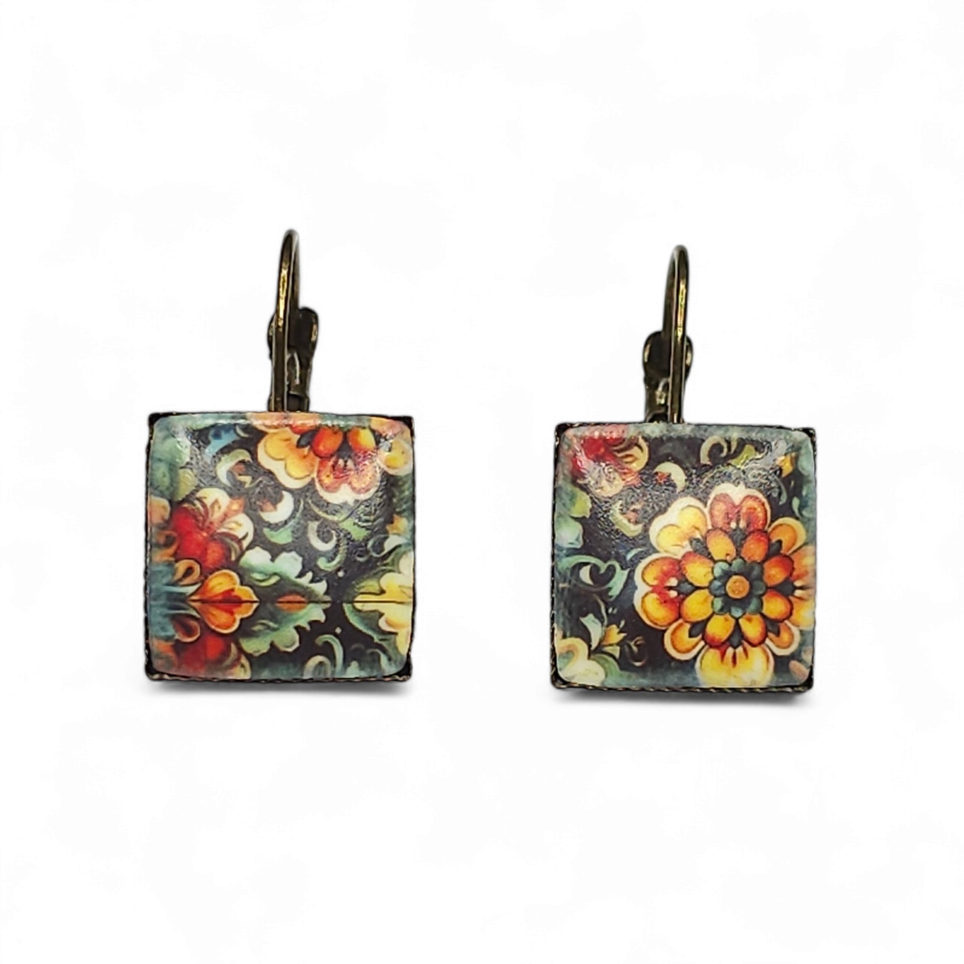 Μικρά κρεμαστά τετράγωνα σκουλαρίκια με μοτίβο πράσινα Μαροκινά πλακάκια από πολυμερικό πηλό.