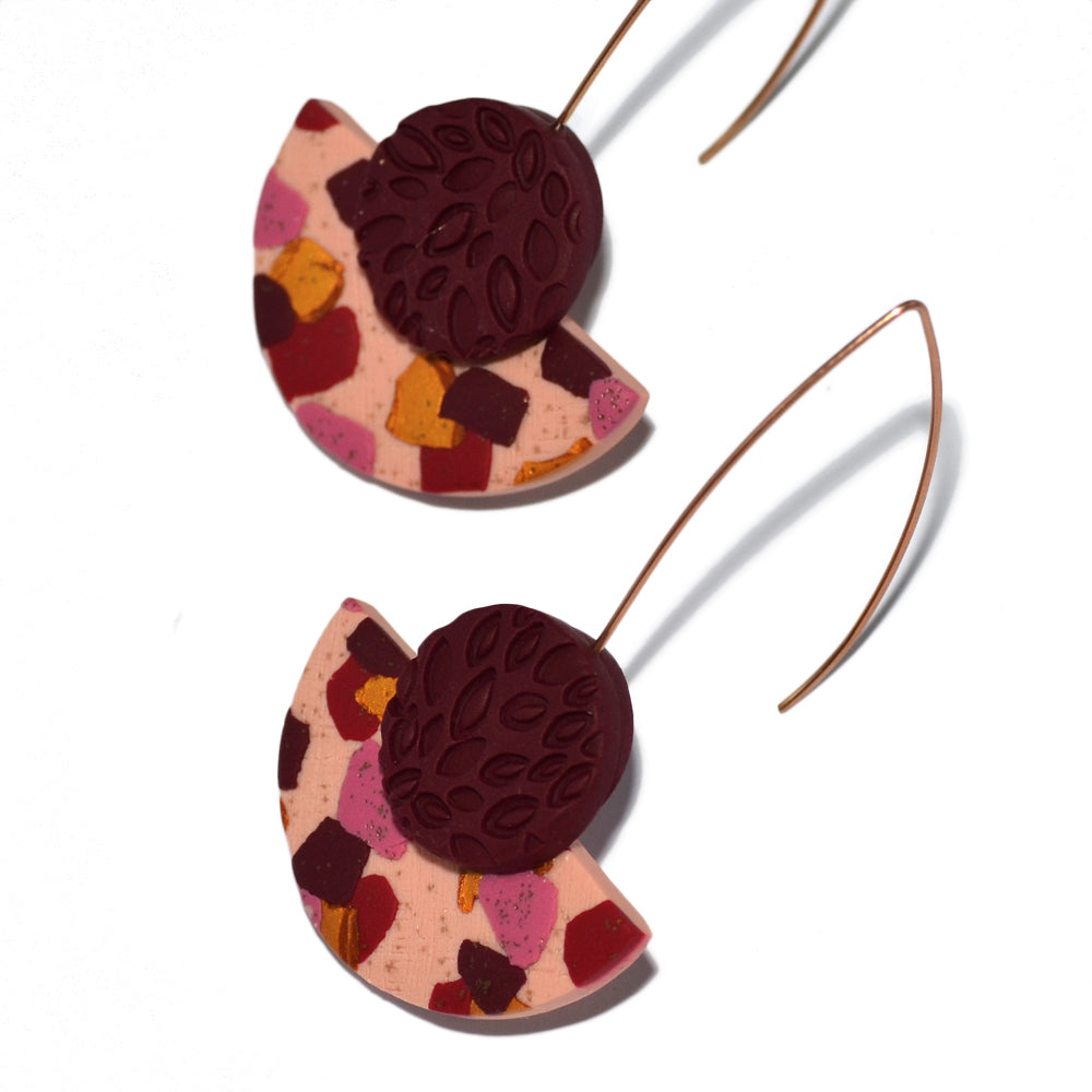 Χειροποίητα κρεμαστά σκουλαρίκια σε μοντέρνα γραμμή από πολυμερικό πηλό. Η τεχνική των ημικυκλίων λέγεται "onalaying" και δίνει αποτέλεσμα μωσαϊκού. Φόντο σε απόχρωση σάπιο μήλο και πιτσιλιές σε μπορντώ, ροζ και χρυσό.