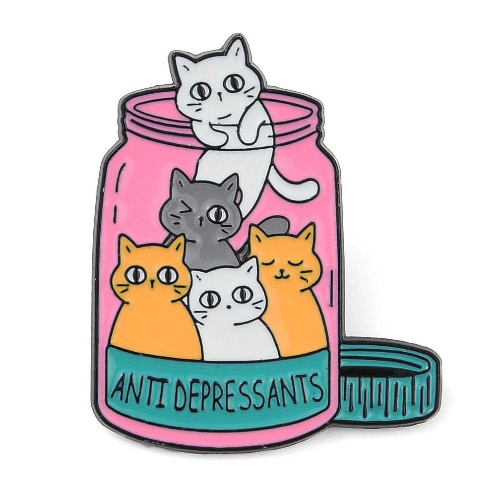 Παιχνιδιάρικη μεταλλική καρφίτσα ροζ βαζάκι με γάτες που γράφει "Antidepressants" (αντικαταθλιπτικά).
