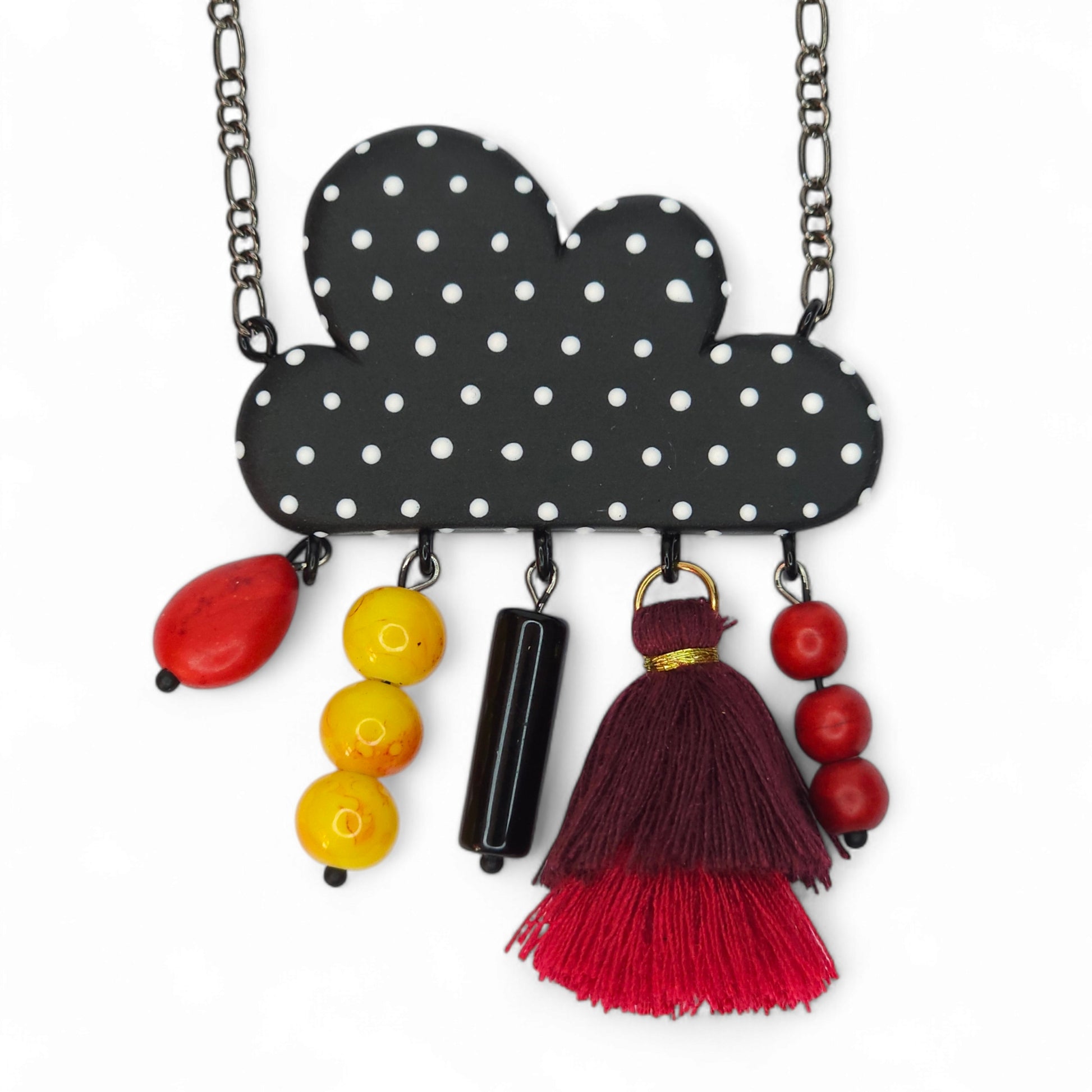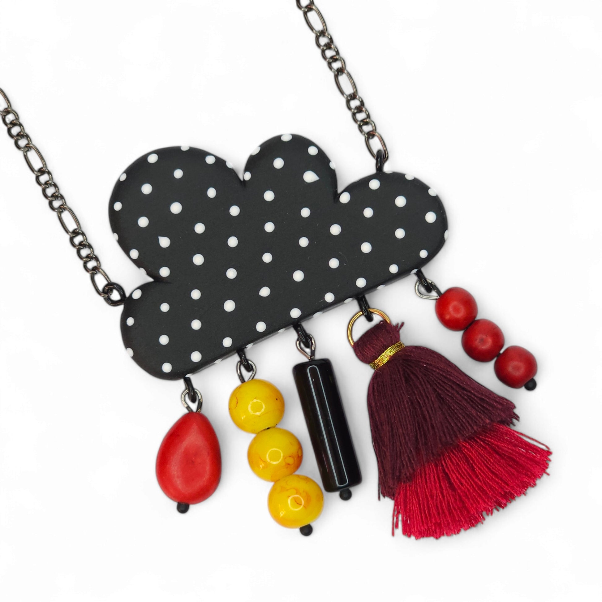 Ρομαντικό μακρύ κολιέ μαύρο πουά σύννεφο από πολυμερικό πηλό με διάφορες κρεμαστές πέτρες, μια μπορντο-κόκκινη φούντα και ταιριαστή αλυσίδα σε gunmetal black απόχρωση 75εκ.