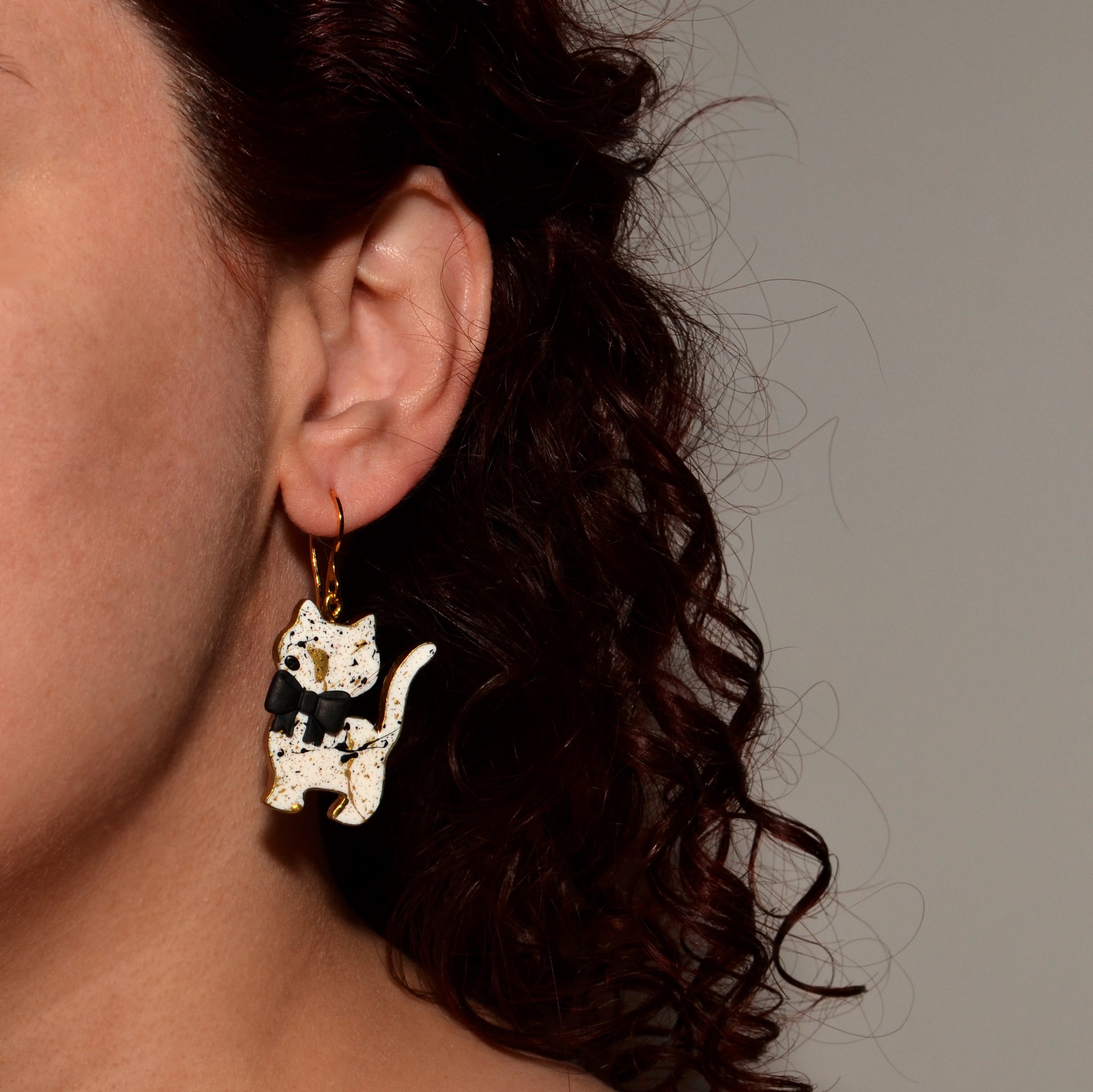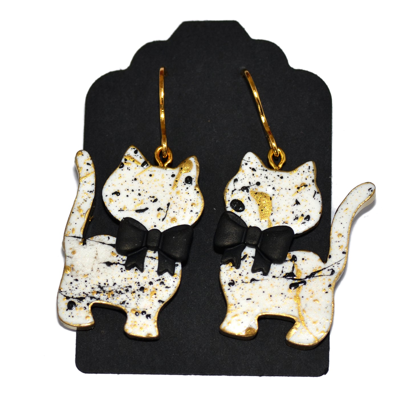 Σκουλαρίκια άσπρες γάτες με μαύρους φιόγκους και χρυσές λεπτομέρειες.