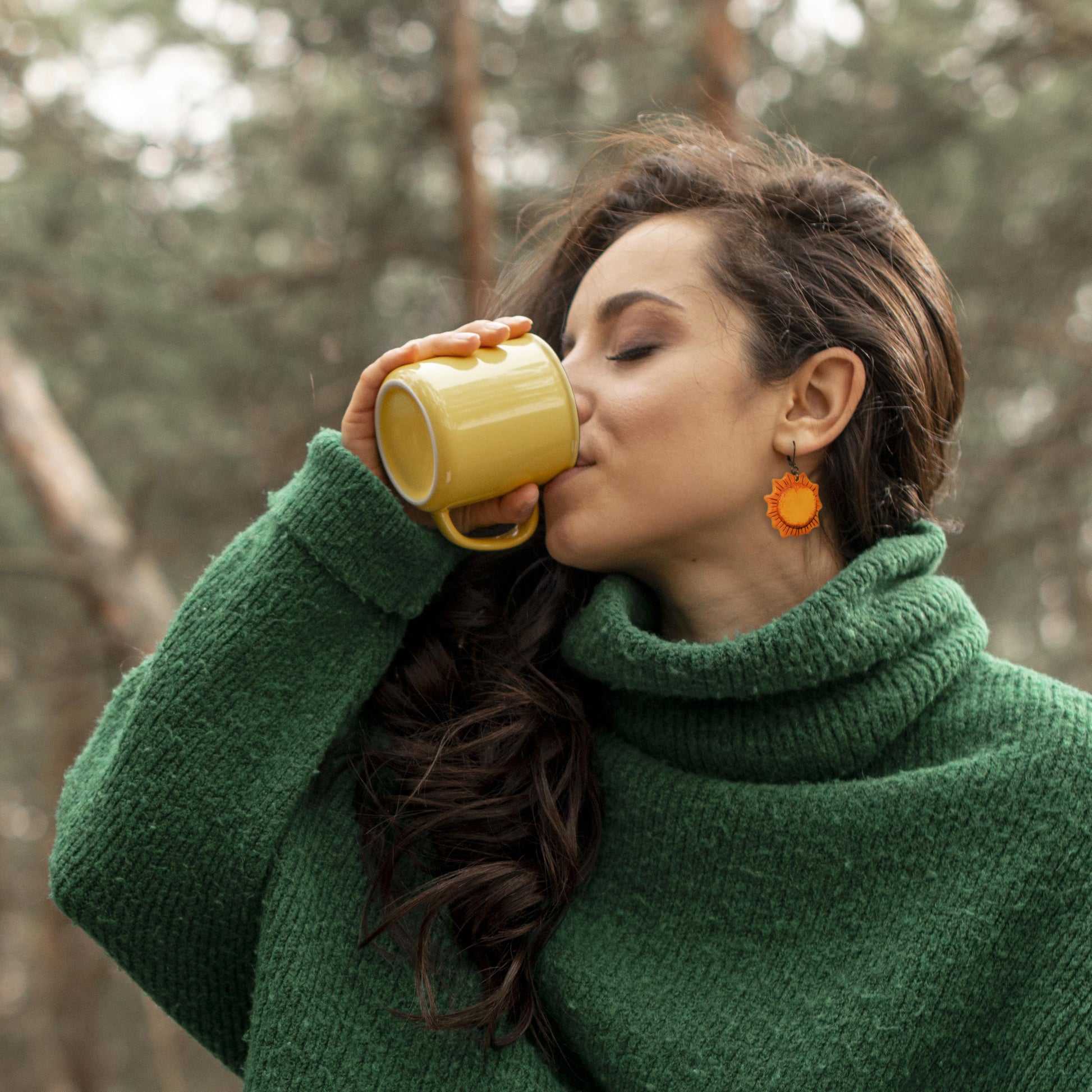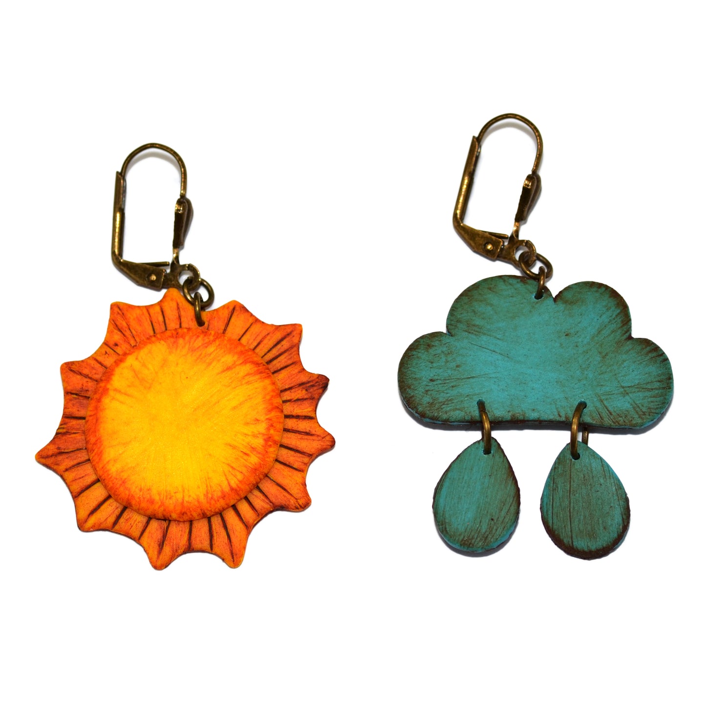 Σκουλαρίκια ανόμοια κρεμαστά, κιτρινο-πορτοκαλί ήλιος ταιριασμένος με μπλε συννεφάκι με βροχή. Περασμένα με πατίνα για παλαιωμένη όψη και ντεγκραντέ απόχρωση.