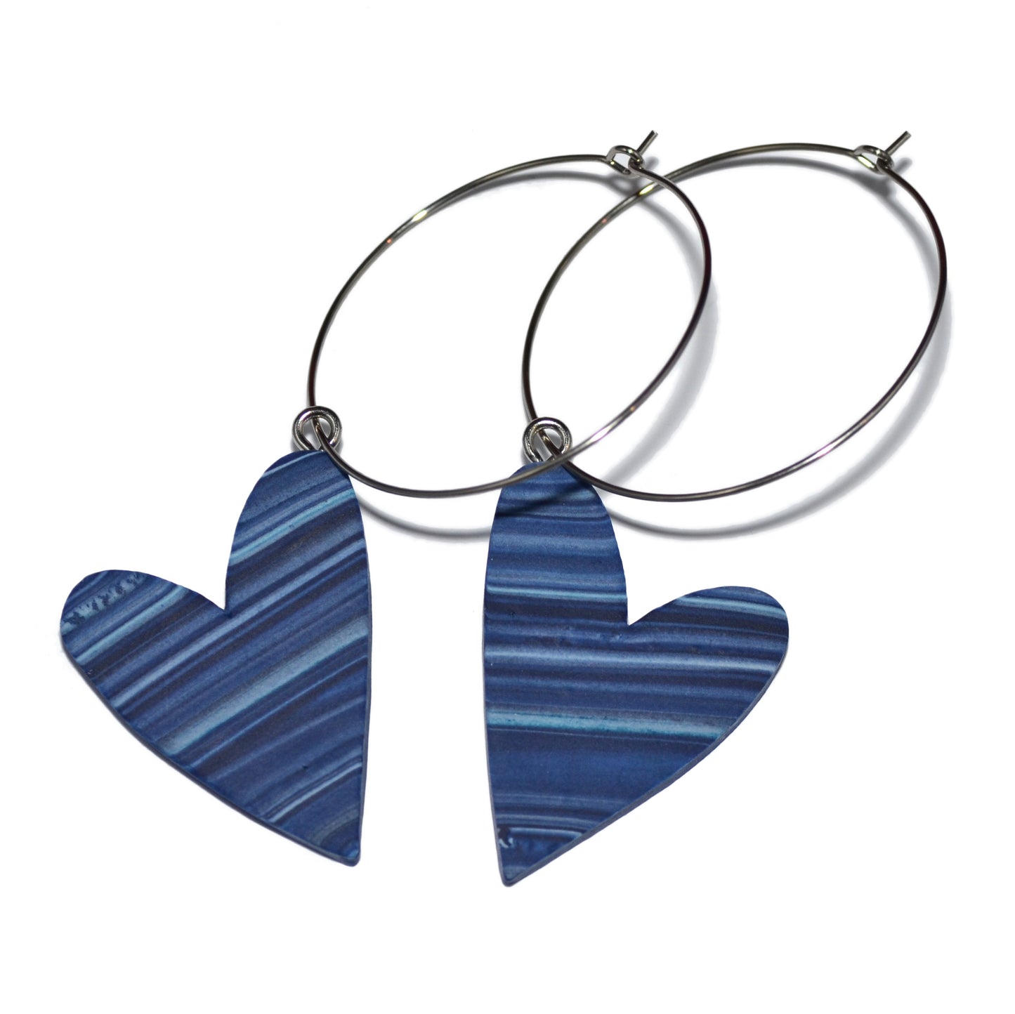 Σκουλαρίκια ατσάλινοι κρίκοι με μπλε ριγέ καρδιές από πολυμερικό πηλό.
