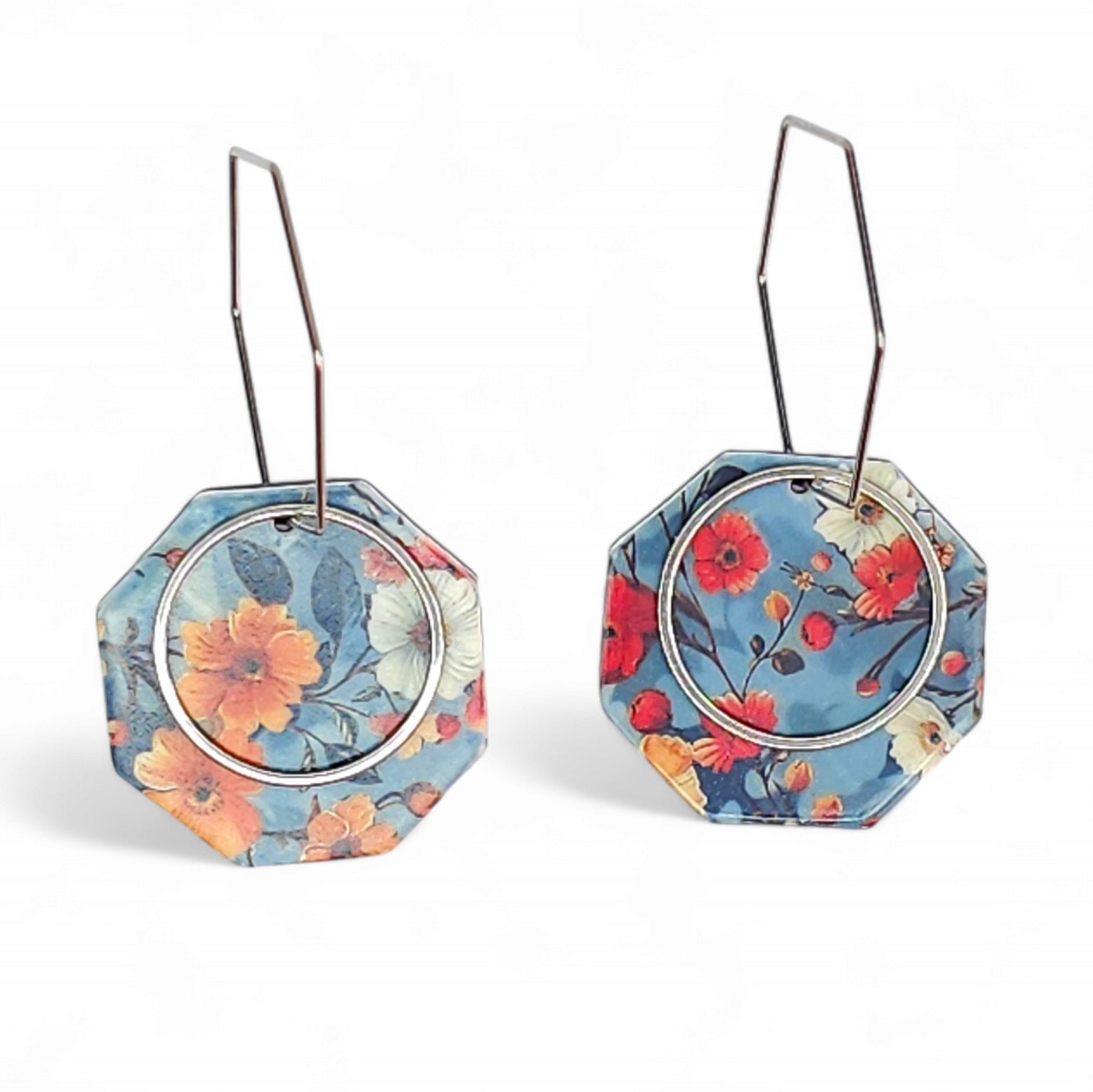 Σκουλαρίκια ατσάλινοι κρίκοι με πολύγωνα στοιχεία με τεχνική μεταφοράς εικόνας σε πολυμερικό πηλό.