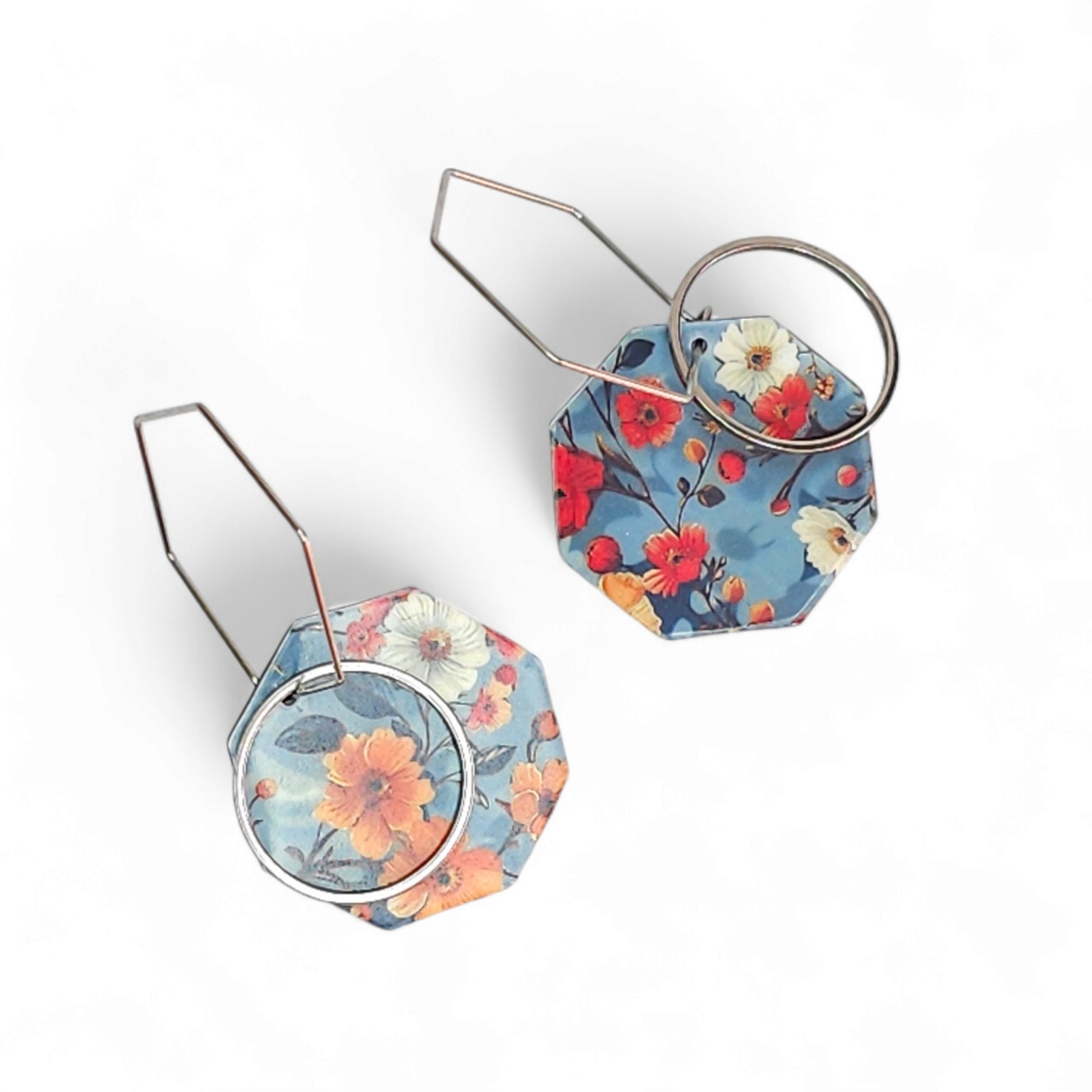 Σκουλαρίκια ατσάλινοι κρίκοι με πολύγωνα στοιχεία με τεχνική μεταφοράς εικόνας σε πολυμερικό πηλό