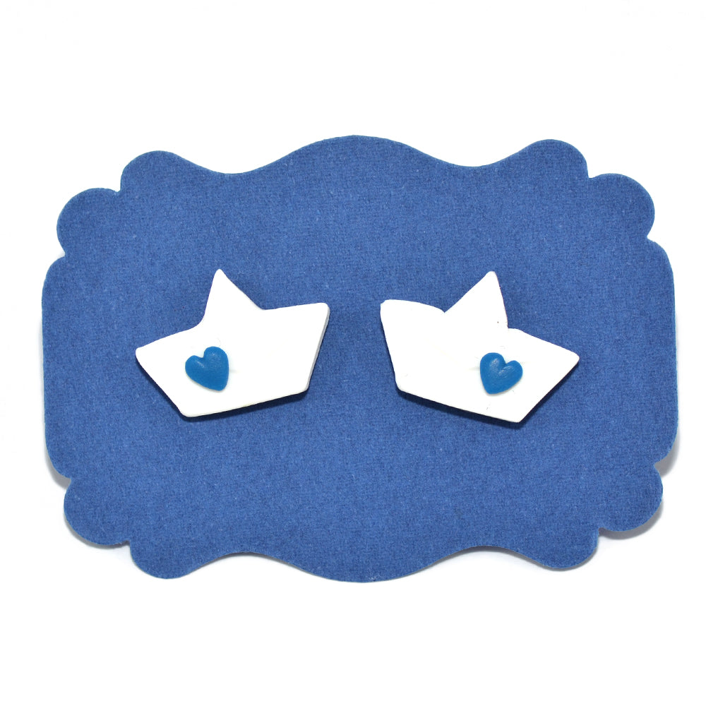 Χειροποίητα καρφωτά σκουλαρίκια κλασσικά άσπρα καραβάκια με μία μικροσκοπική μπλε καρδούλα το καθένα.