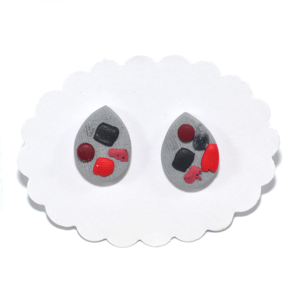 Σκουλαρίκια καρφωτά γκρι πιτσιλωτό με σκούρο γκρι, κόκκινο και μπορντό σε σχήμα δάκρυ.