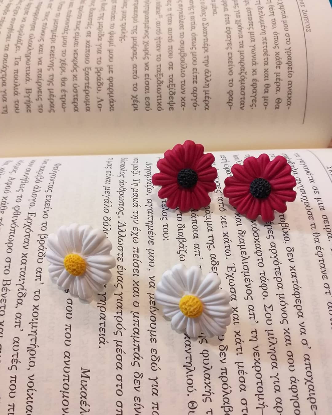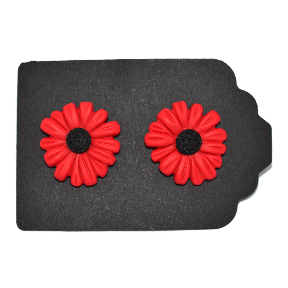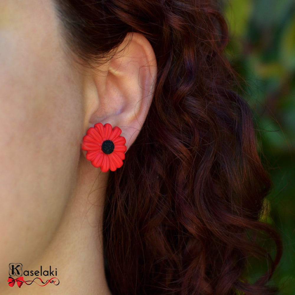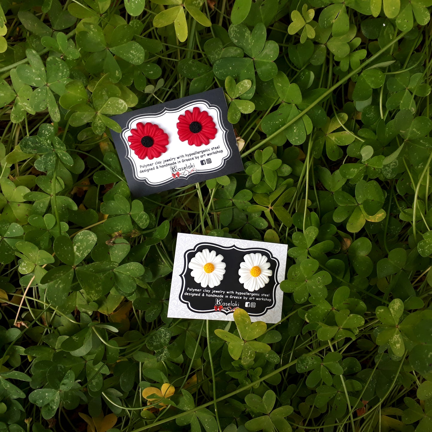 Σκουλαρίκια καρφωτά λουλούδια σε σχήμα μαργαρίτας με κόκκινο και μαύρο πολυμερικό πηλό.