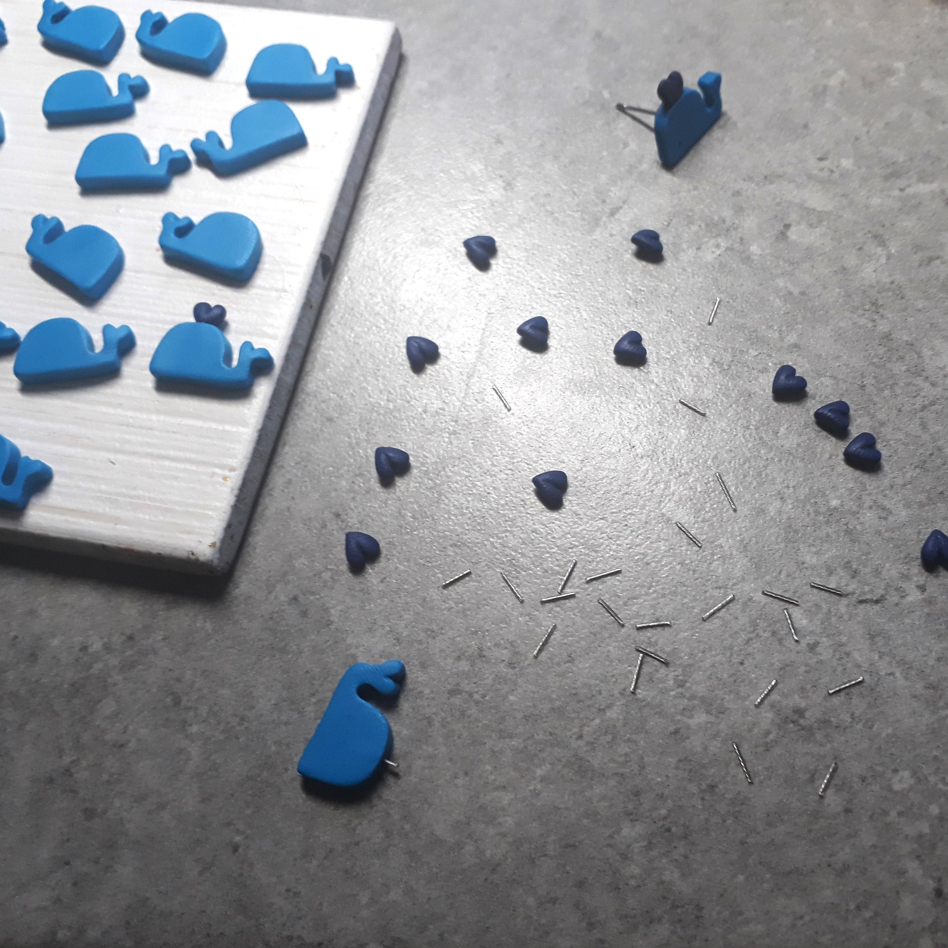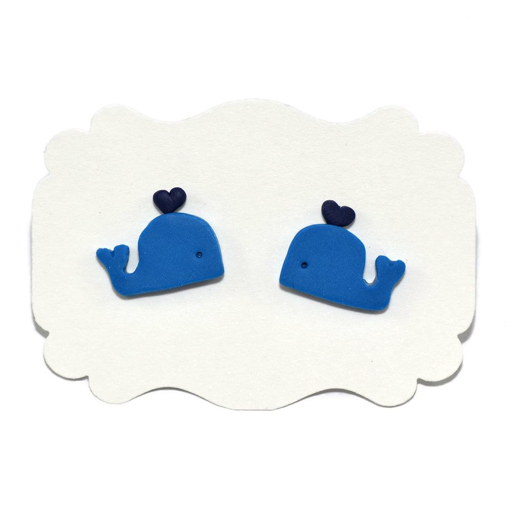 Σκουλαρίκια καρφωτά μπλε φαλαινίτσες κομμένες στο χέρι με μια μικροσκοπική μπλε μαρίν καρδούλα για φυσητήρα.
