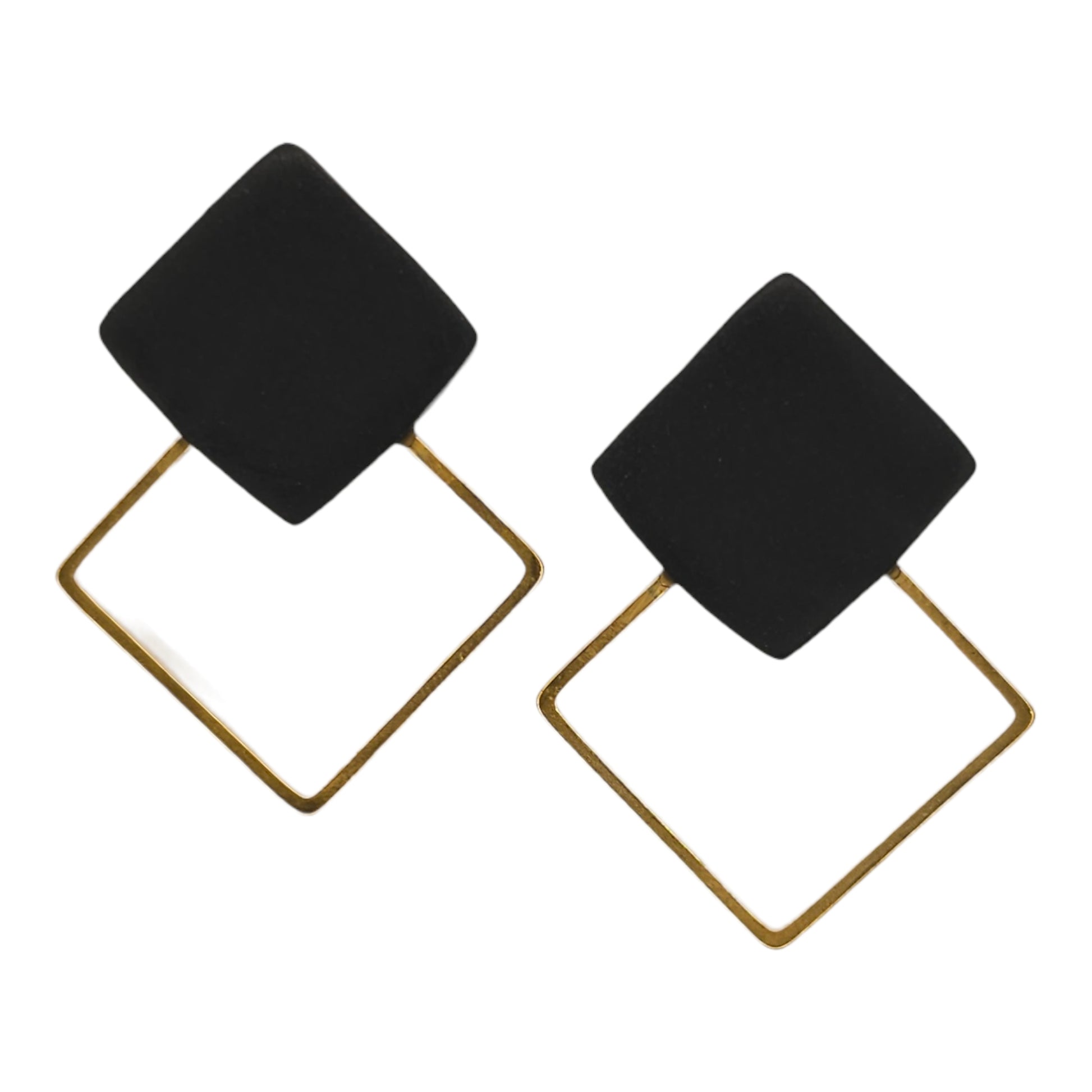 Σκουλαρίκια καρφωτά τετράγωνα μαύρα από πολυμερικό πηλό και επιχρυσωμένα τετράγωνα ατσάλινα στοιχεία.