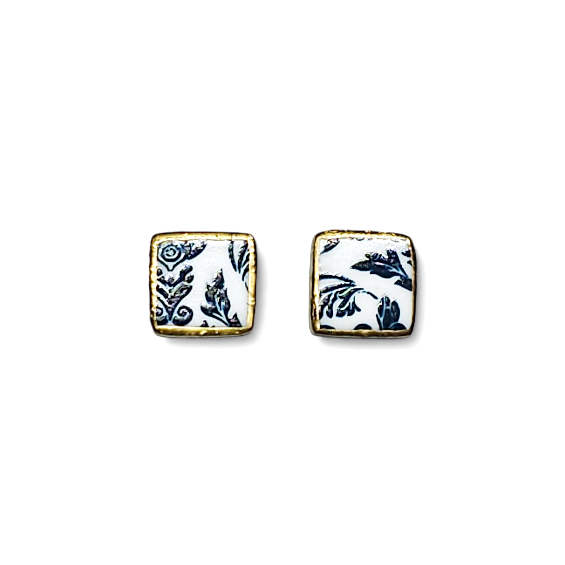 Σκουλαρίκια καρφωτά τετραγωνάκια με μπλε μεταξοτυπία σε μπαρόκ στυλ από πολυμερικό πηλό.