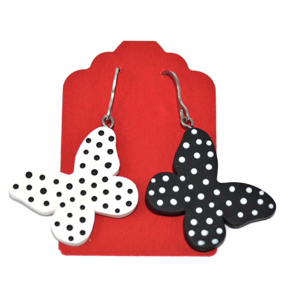 Σκουλαρίκια κρεμαστά ασπρόμαυρες πουά πεταλούδες.