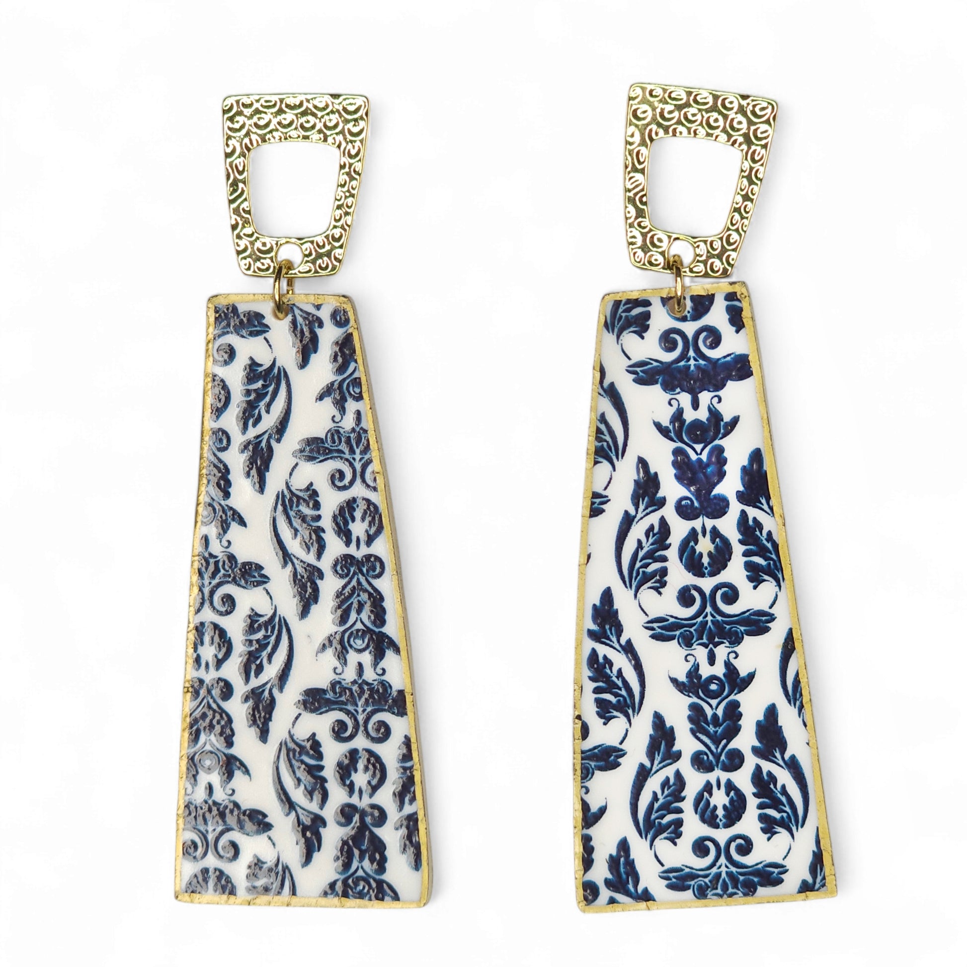 Χειροποίητα σκουλαρίκια κρεμαστά ασύμμετρα παραλληλόγραμμα μπλε μεταξοτυπία σε μπαρόκ στυλ από πολυμερικό πηλό και χρυσά πολυεδρικά καρφάκια.