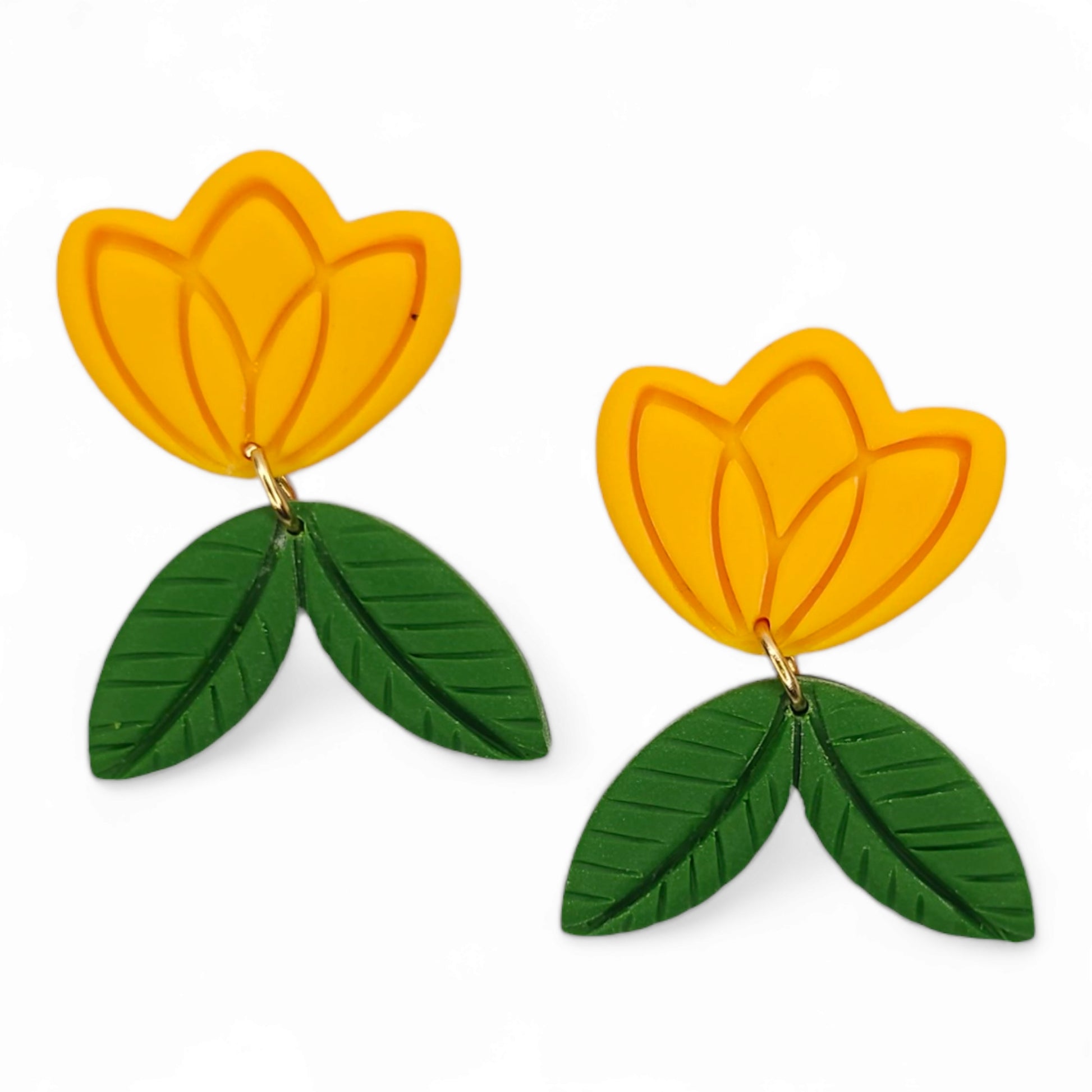 Σκουλαρίκια με ένα σταθερό στοιχείο κίτρινη τουλίπα κι ένα κρεμαστό στοιχείο πράσινο φύλλο από πολυμερικό πηλό.