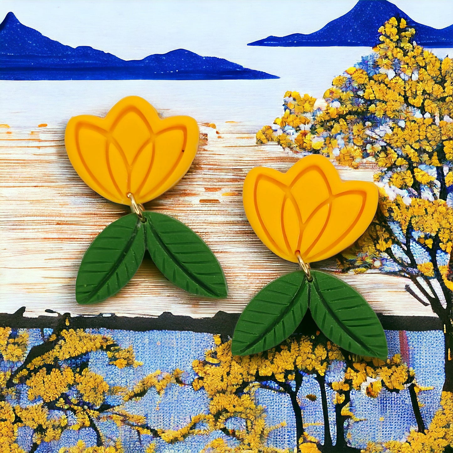 Σκουλαρίκια κρεμαστά κίτρινες τουλίπες με πράσινα φύλλα από πολυμερικό πηλό