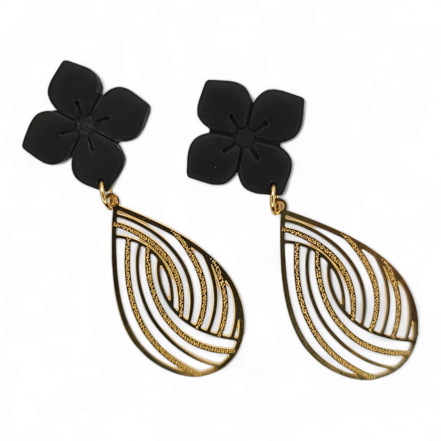 Σκουλαρίκια με ένα σταθερό στοιχείο μαύρο λουλούδι από πολυμερικό πηλό κι ένα κρεμαστό επιχρυσωμένο ατσάλινο δαντελένιο φιλιγκράν σε σχήμα δάκρυ.