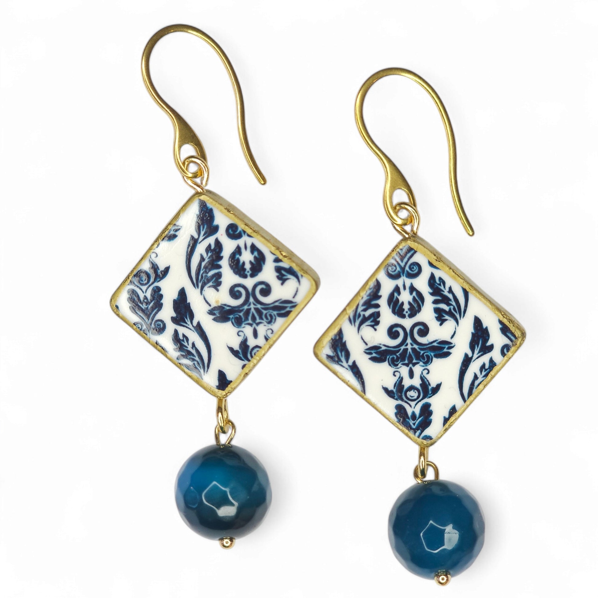 Σκουλαρίκια κρεμαστά τετράγωνα μπλε μεταξοτυπία σε μπαρόκ στυλ από πολυμερικό πηλό, μπλε πέτρες αχάτη κι επιχρυσωμένα υποαλλεργικά ατσάλινα γαντζάκια.