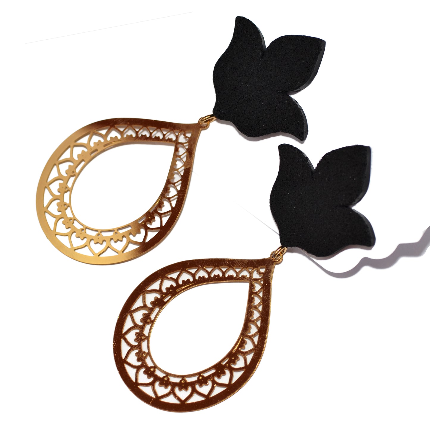 Σκουλαρίκια μακριά μαύρα λουλούδια με επιχρυσωμένα ατσάλινα φιλιγκράν σε σχήμα δάκρυ.