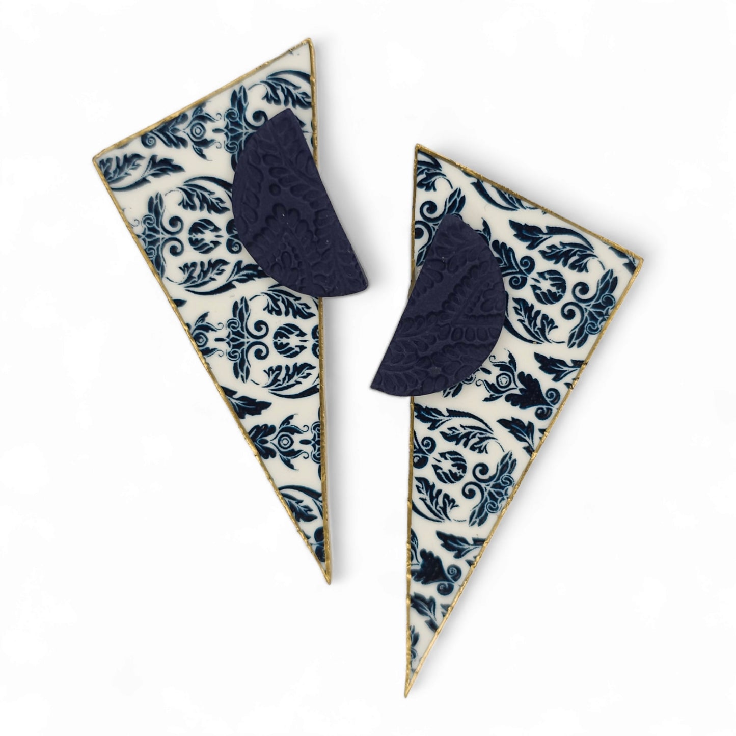 Σκουλαρίκια μεγάλα καρφωτά τρίγωνα με μπλε μεταξοτυπία σε μπαρόκ στυλ και μπλε ανάγλυφα ημικύκλια από πολυμερικό πηλό.