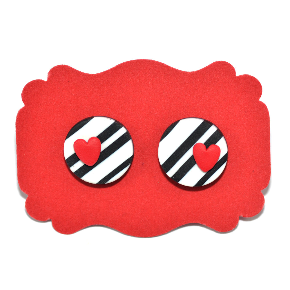 Σκουλαρίκια στρόγγυλα καρφωτά ασπρόμαυρο ριγέ με κόκκινη καρδιά.