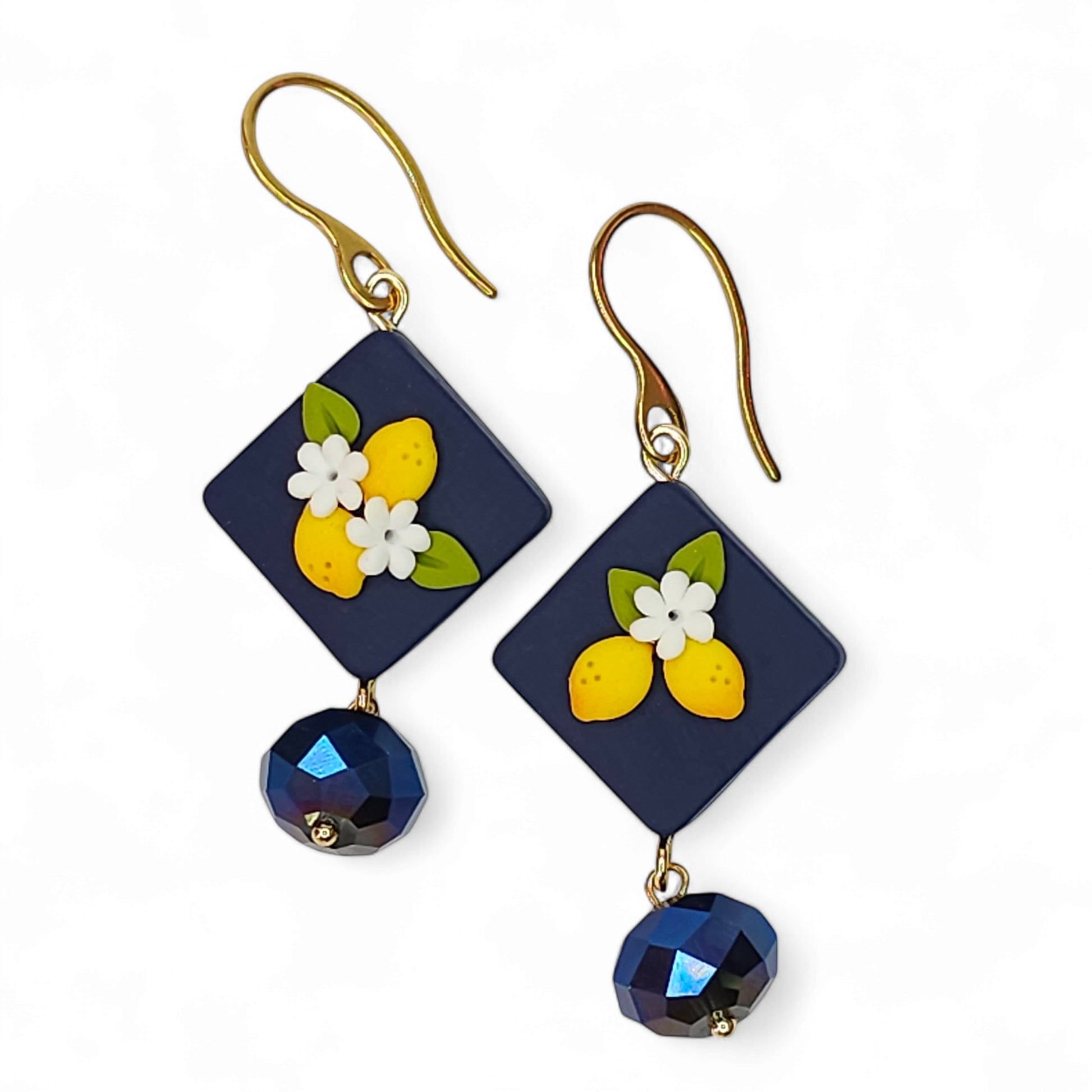 Σκουλαρίκια τετράγωνα κρεμαστά κίτρινα λεμόνια σε μπλε φόντο από πολυμερικό πηλό, μπλε κρύσταλλα και υποαλλεργικά επιχρυσωμένα ατσάλινα γαντζάκια.