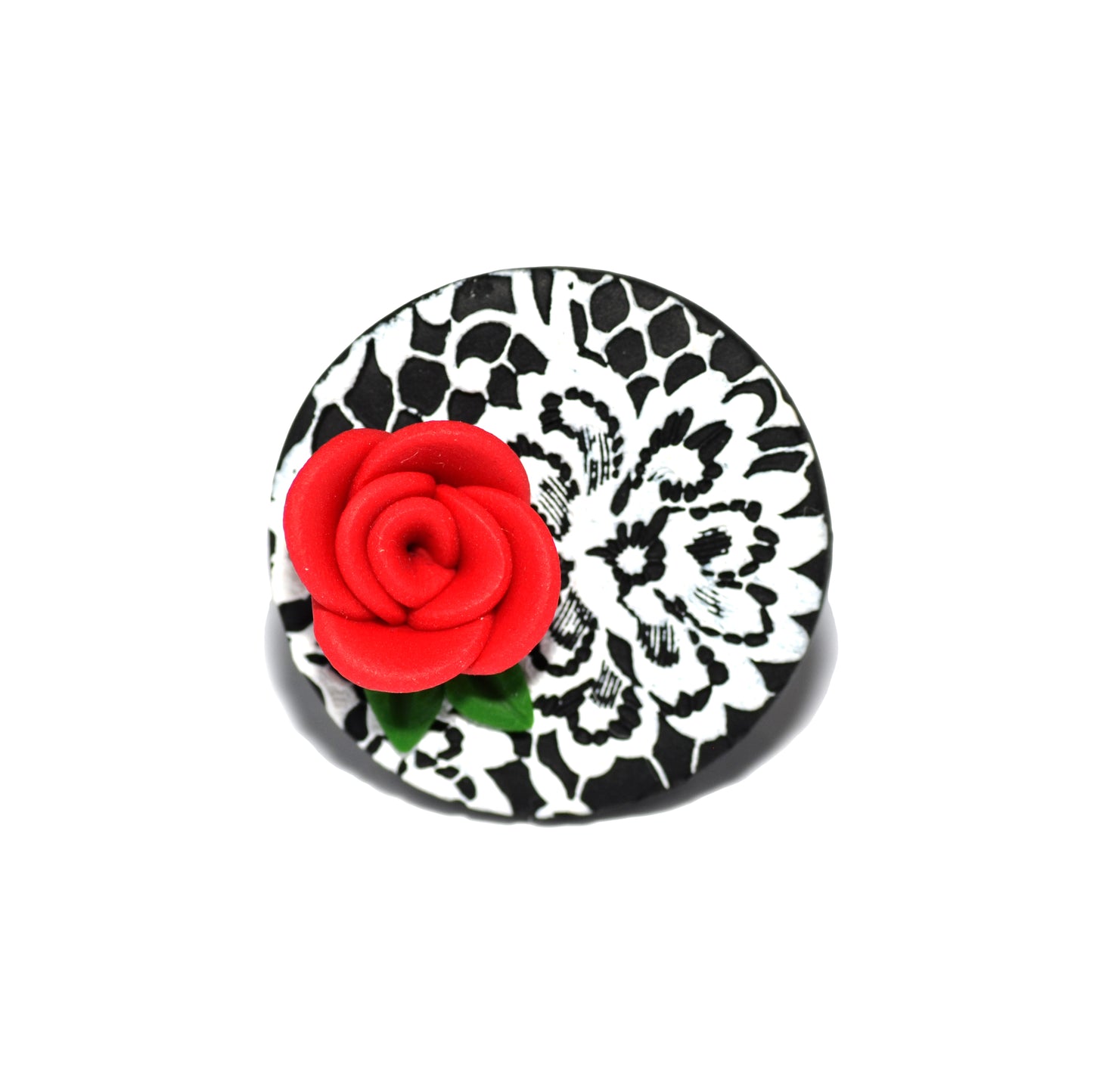 Στρογγυλό δαχτυλίδι λευκή δαντέλα σε μαύρο φόντο με κόκκινο τριαντάφυλλο και υποαλλεργική ρυθμιζόμενη ατσάλινη βάση.