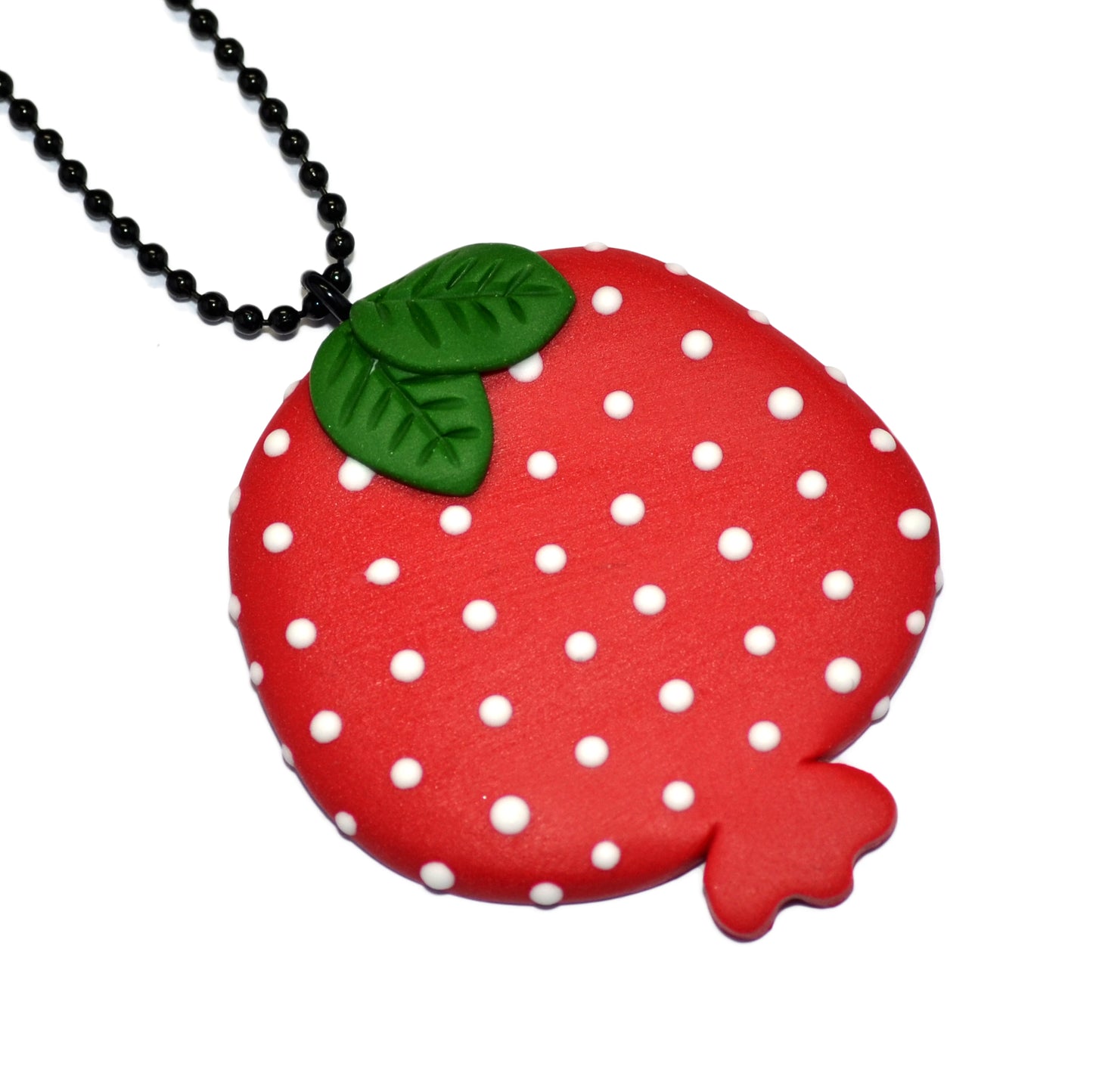 Χειροποίητο χριστουγεννιάτικο κολιέ από πολυμερικό πηλό ρόδι κόκκινο λευκό πουά με δύο πράσινα φυλλαράκια και ταιριαστή μαύρη αλυσίδα με μπίλιες.