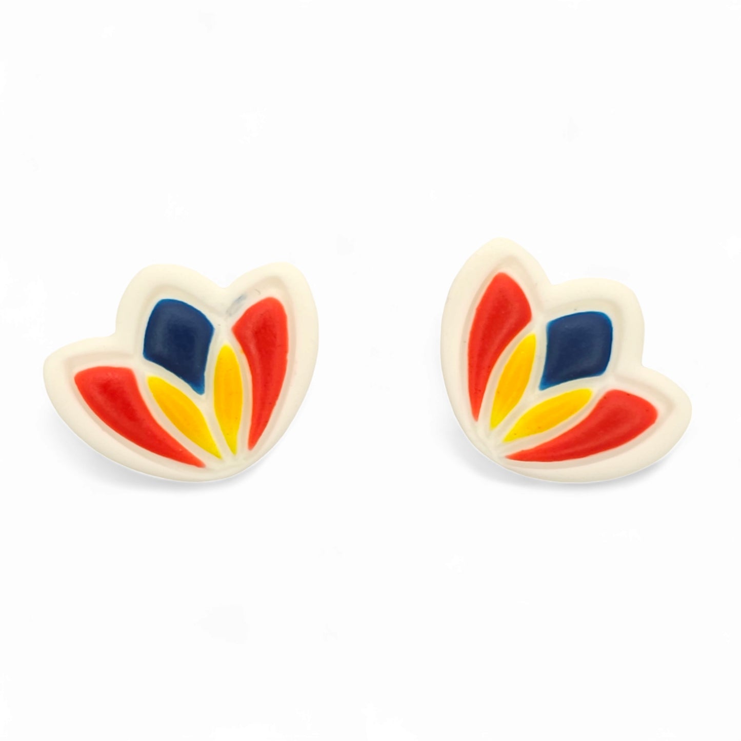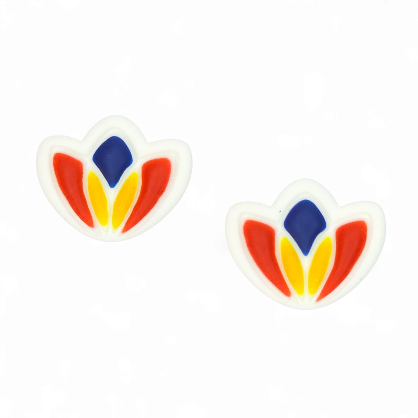 Kαρφωτά σκουλαρίκια λευκά λουλούδια με κόκκινες κίτρινες και μπλε λεπτομέρειες από πολυμερικό πηλό.