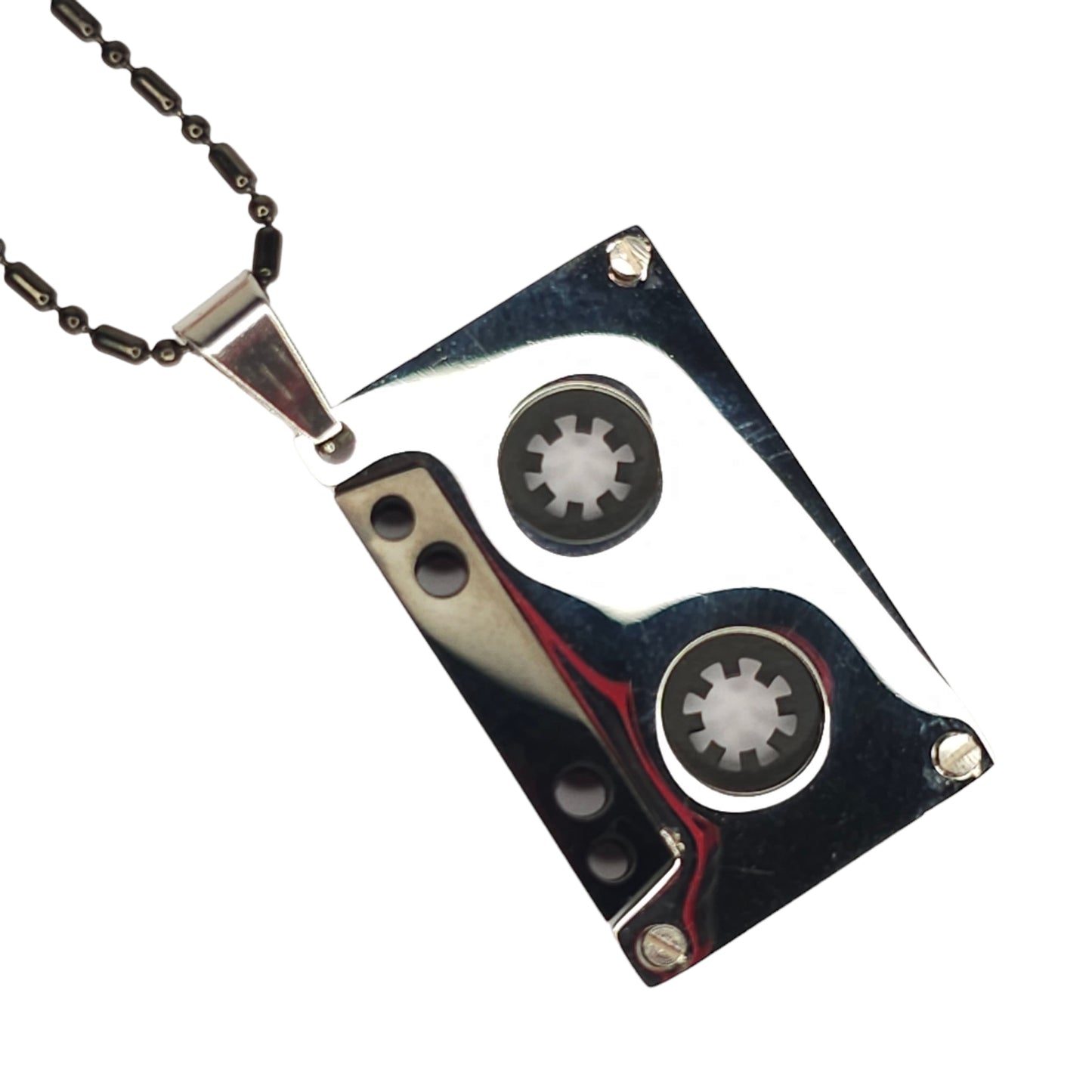 Mακρύ μενταγιόν κασέτα σε ασημί με μαύρο από ανοξείδωτο ατσάλι