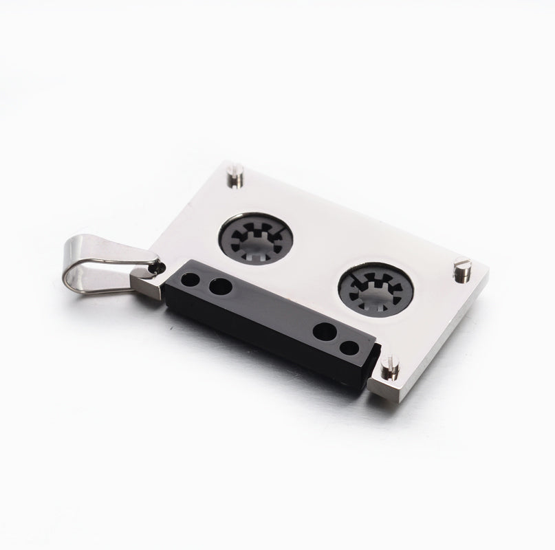 Mακρύ μενταγιόν κασέτα σε ασημί με μαύρο από ανοξείδωτο ατσάλι.