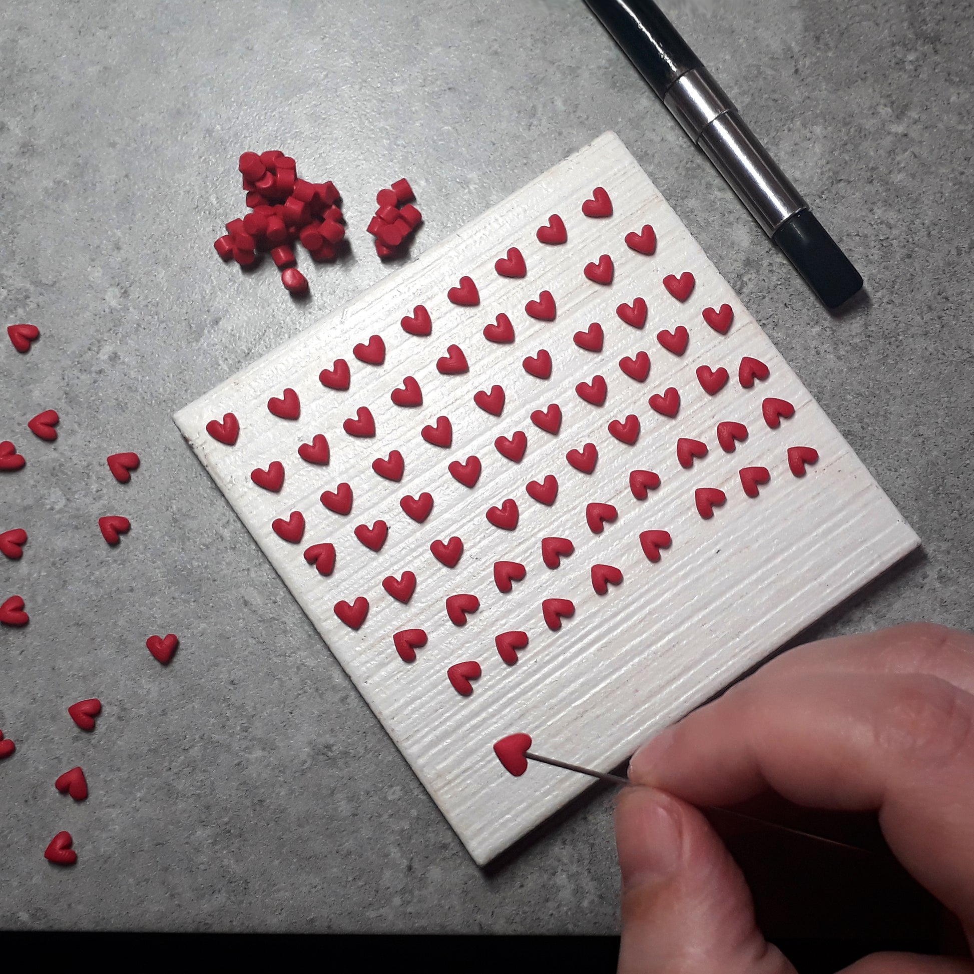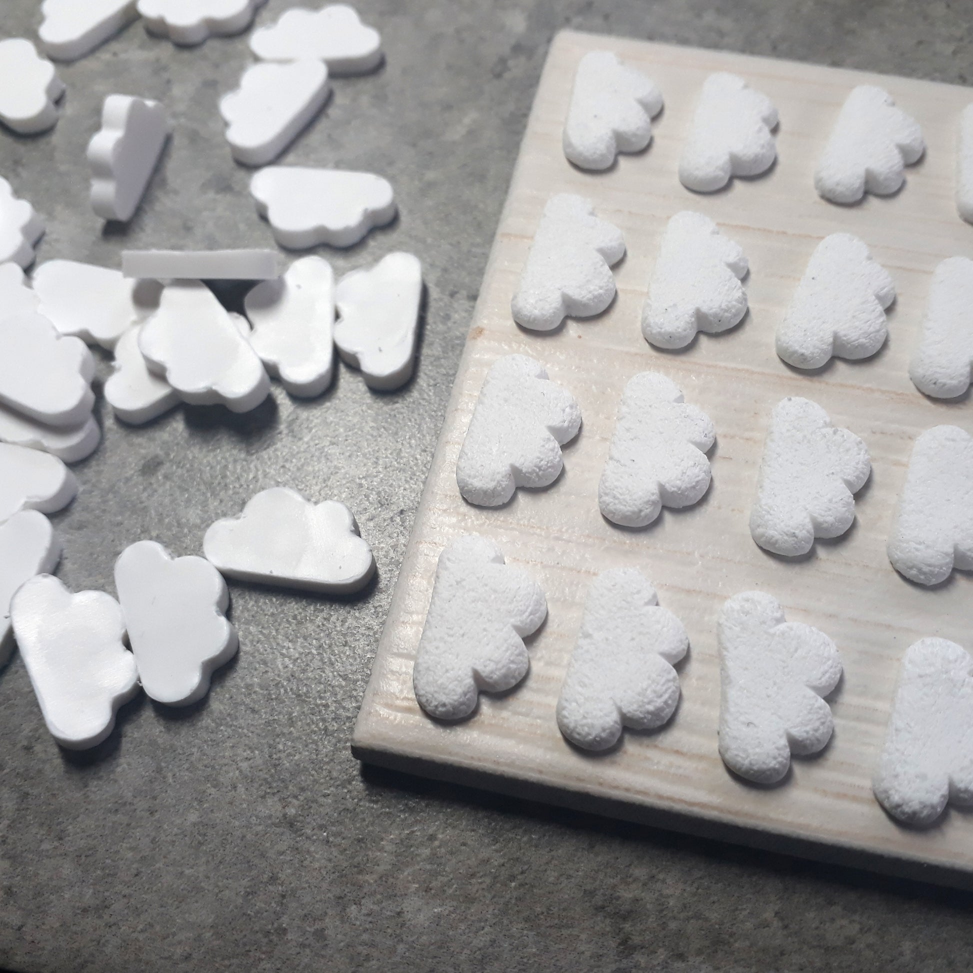 Χειροποίητα καρφωτά σκουλαρίκια λευκά συννεφάκια κομμένα στο χέρι με δύο μικρούτσικες κόκκινες καρδούλες να κρέμονται από το καθένα, φτιαγμένα με πολυμερικό πηλό.